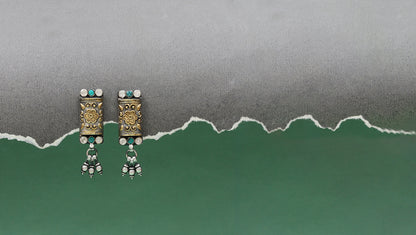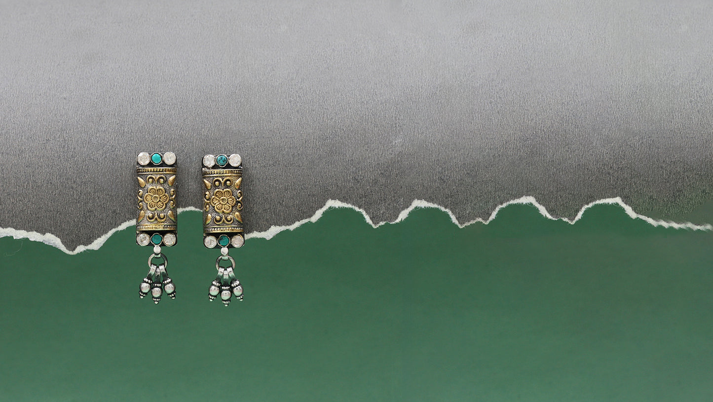 Inspired by tribal aesthetics, these oxidized silver earrings by Sangeeta Boochra showcase fine floral detailing with gold accents and Green gemstone highlights. The hanging silver beads add a touch of elegance, making them an ideal accessory for ethnic wear.