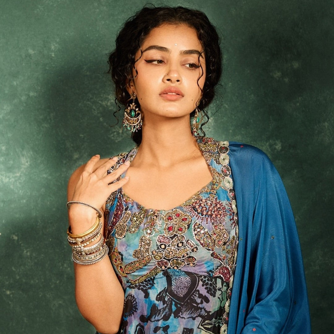 Adorned in Sangeeta Boochra’s exquisite silver earrings and bangles, Anupama Parameswaran brings alive the beauty of handcrafted heritage jewellery. The artistic motifs, oxidised finish, and colourful stone detailing create a striking fusion that perfectly complements her vibrant festive look.