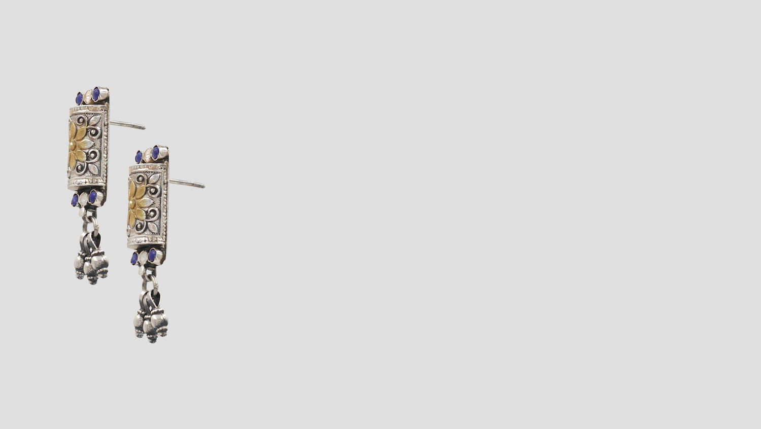 A perfect blend of tradition and modernity, these rectangular drop earrings showcase a fine mix of oxidized silver, gold-toned floral motifs, and striking blue and white stone accents. Ideal for casual and festive wear, these earrings exude timeless elegance.