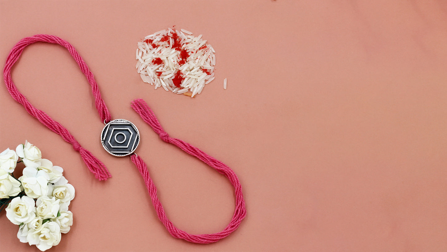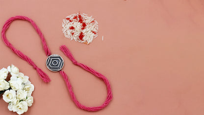 Celebrate the bond of love with this handcrafted silver rakhi featuring a unique hexagonal design. Designed by Sangeeta Boochra, this rakhi blends contemporary minimalism with traditional craftsmanship. The vibrant pink thread adds a joyful festive touch.
