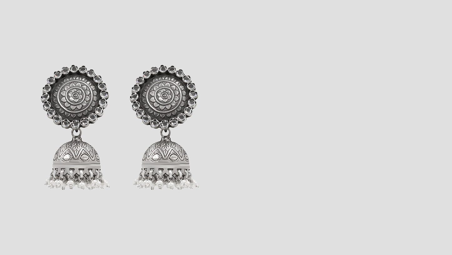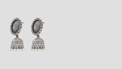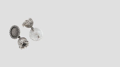 A timeless blend of culture and craftsmanship.These oxidized silver earrings by Sangeeta Boochra feature a radiant circular mandala design, paired with intricately embossed domes and floral danglers, making them perfect for ethnic ensembles..