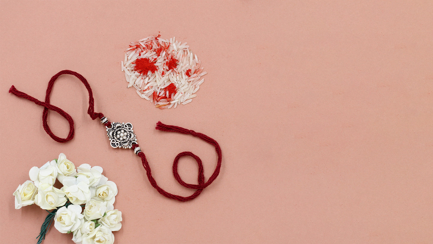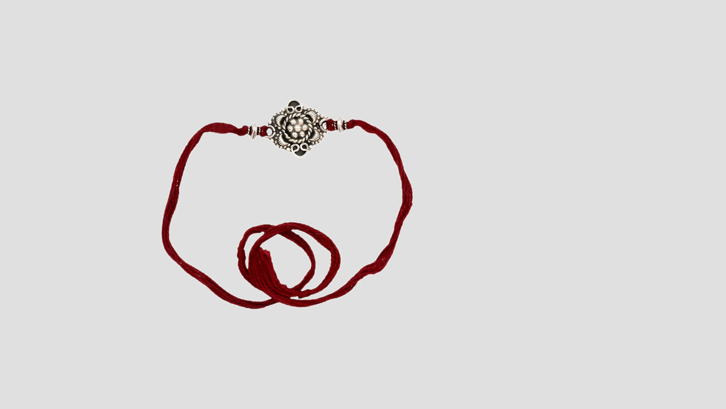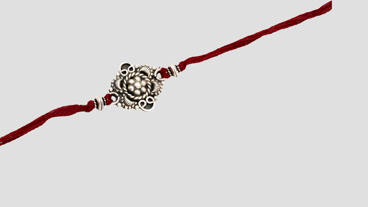 This ethnic silver rakhi showcases a detailed oxidized finish, making it a perfect choice for brothers who appreciate traditional craftsmanship. The red thread adds a spiritual touch to the overall look.
