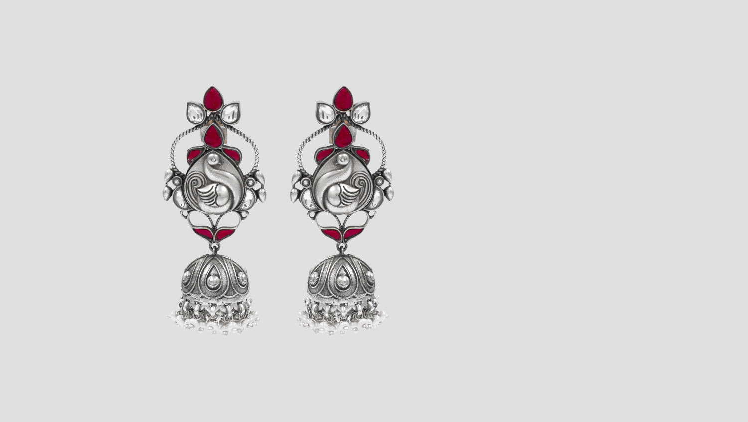 Celebrate timeless elegance with these handcrafted silver earrings by Sangeeta Boochra. Featuring intricate bird motifs, red enamel accents, and traditional jhumka drops adorned with tiny pearls, this piece beautifully blends heritage artistry with modern grace.