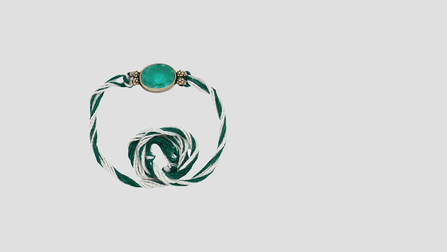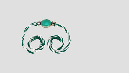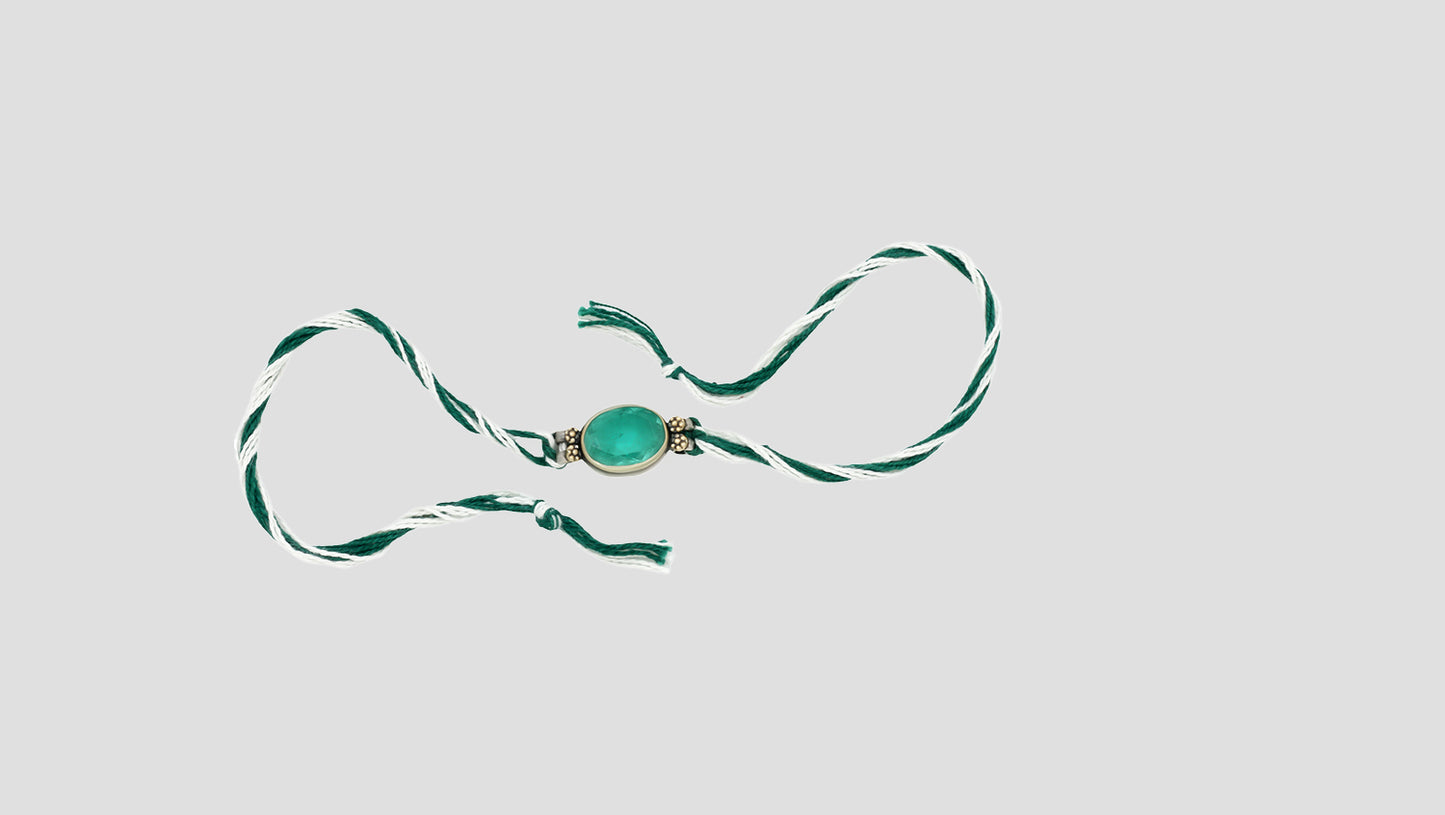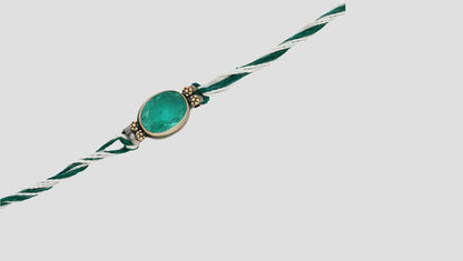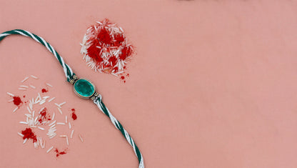 Inspired by regal aesthetics, this Rakhi combines a rich green centerpiece with delicate silver detailing, offering a minimalist yet luxurious feel — the signature style of Sangeeta Boochra.