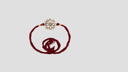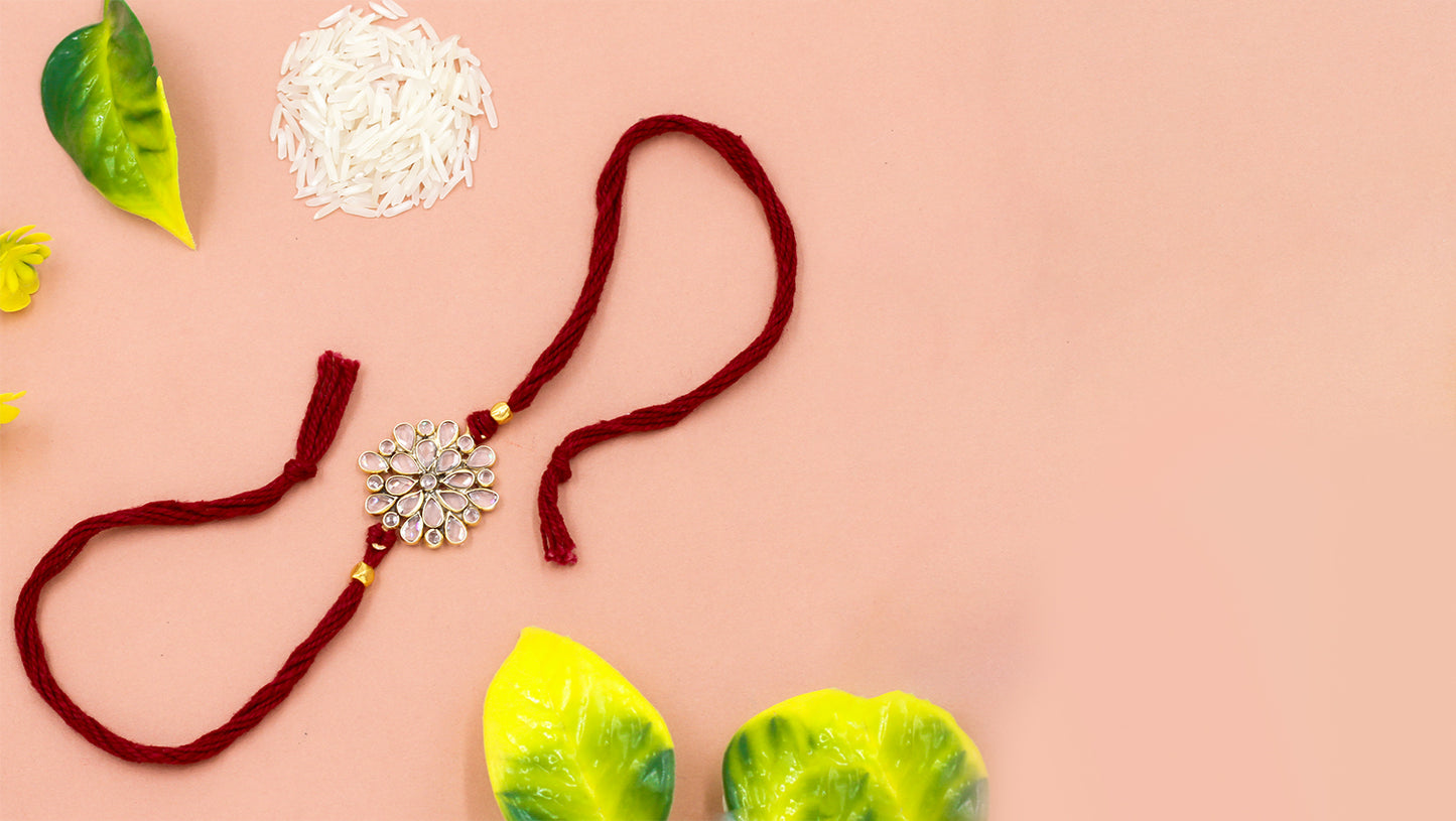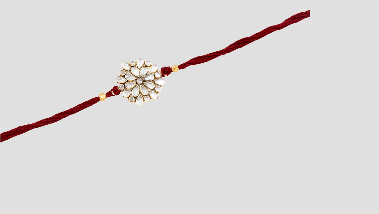 This rakhi is a tribute to timeless Indian artistry. A silver-toned floral design adorned with uncut-style mirror stones rests on a soft maroon thread, symbolizing strength, purity, and love.