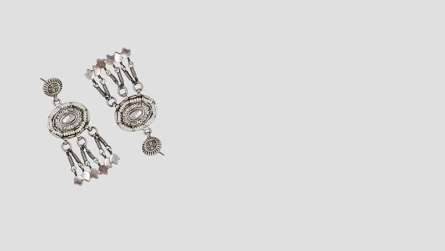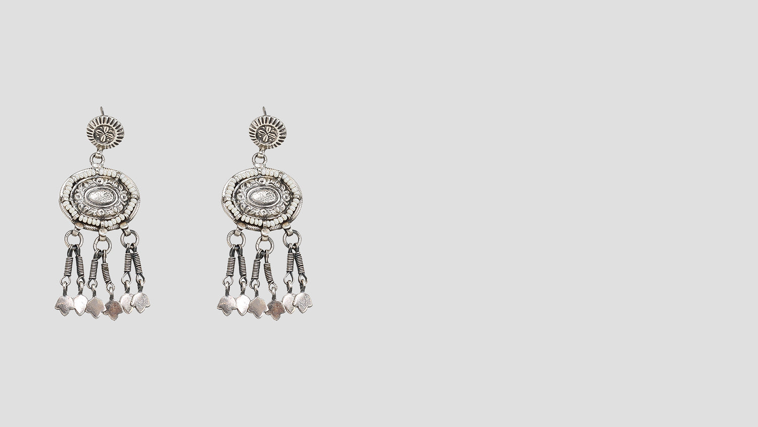 A masterpiece of Indian craftsmanship, these Sangeeta Boochra silver earrings feature intricate oval detailing with artistic hanging charms. Perfect for adding a touch of vintage sophistication to any outfit.