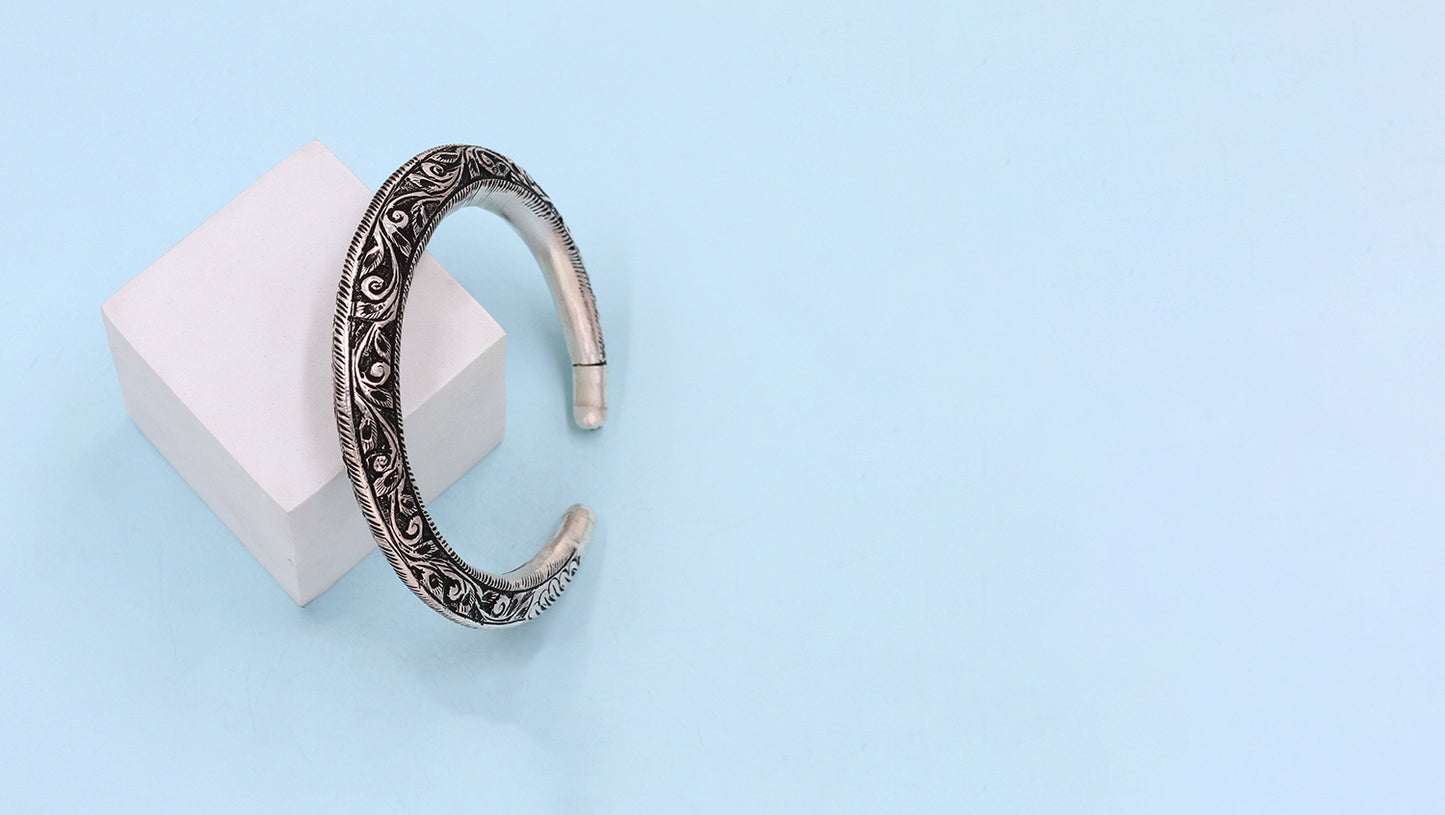 Celebrate tradition with this intricately floral-engraved 925 silver kada by Sangeeta Boochra. A perfect blend of detailed craftsmanship and timeless elegance.