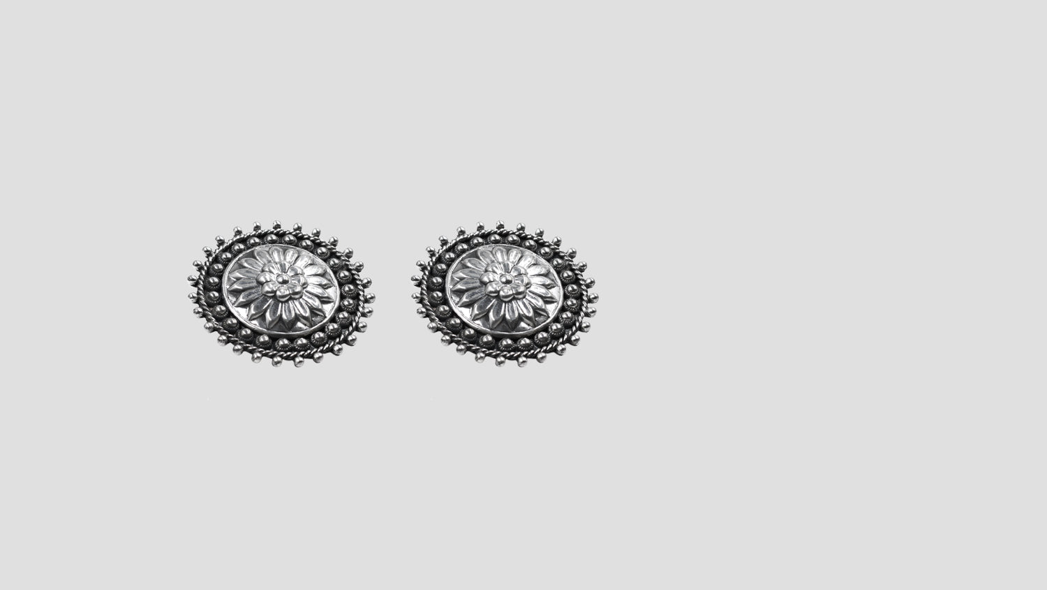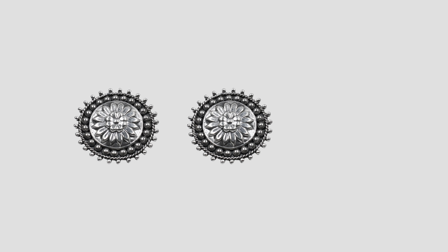 A timeless piece from Sangeeta Boochra’s signature collection, these handcrafted oxidised silver Studs feature a detailed floral motif encircled by intricate beaded edging. Perfect for elevating both ethnic and contemporary looks.