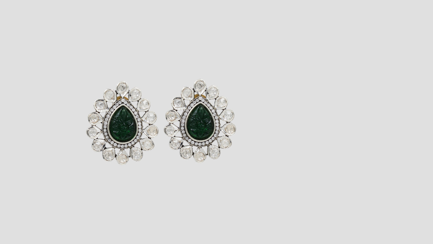 Celebrate timeless artistry with these silver earrings from Sangeeta Boochra. The rich green carved gemstone centerpiece surrounded by luminous white stones creates a royal charm, making them a statement accessory for any occasion.