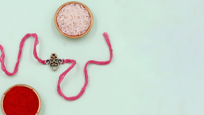 Celebrate the timeless bond of love and protection with this intricately crafted silver Rakhi by Sangeeta Boochra. Designed with an antique finish and set on vibrant pink threads, this Rakhi blends heritage artistry with modern elegance.