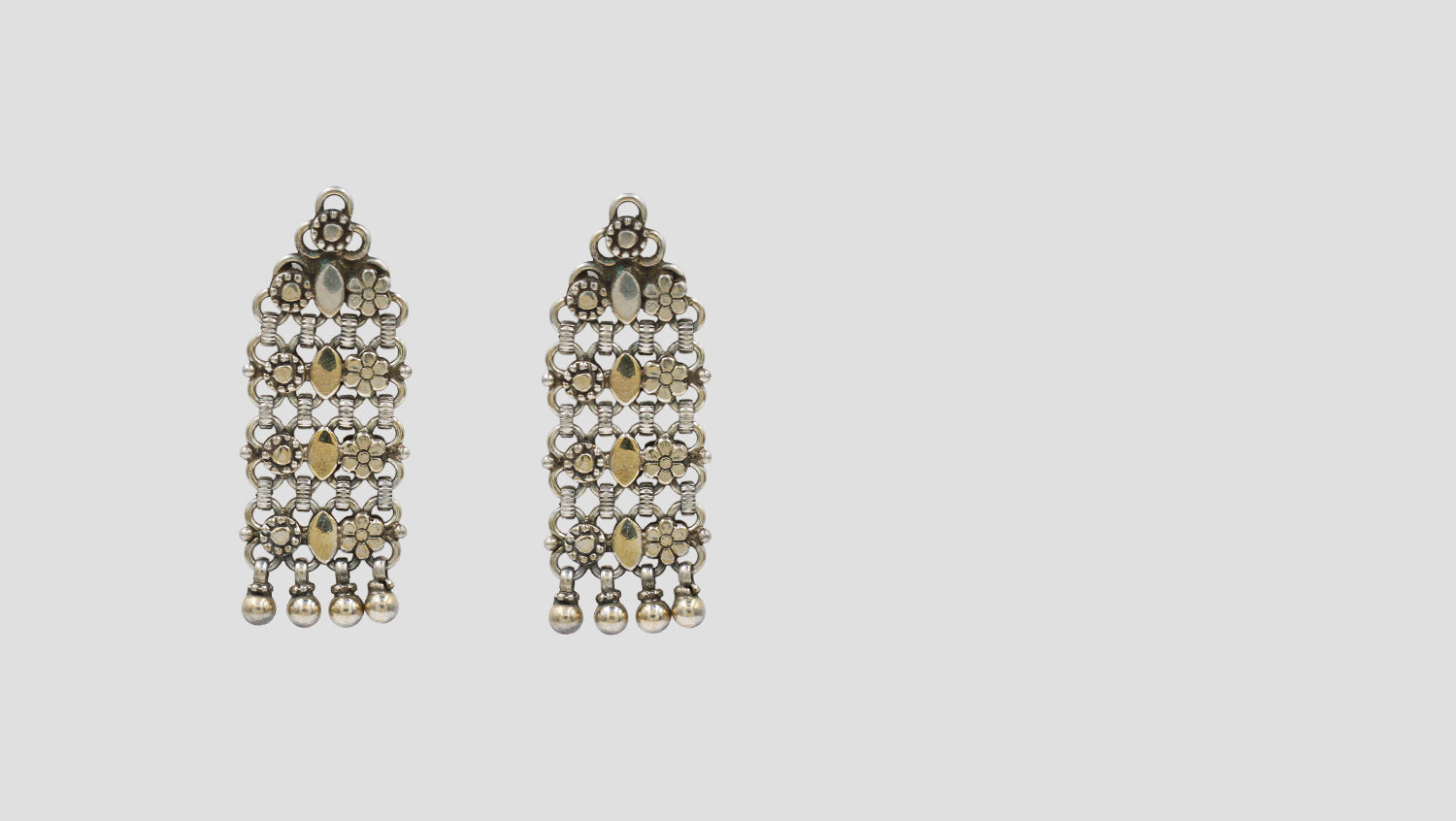 Crafted in sterling silver, these long floral earrings showcase delicate filigree work with subtle antique finishing. A statement piece from Sangeeta Boochra’s signature heritage collection.