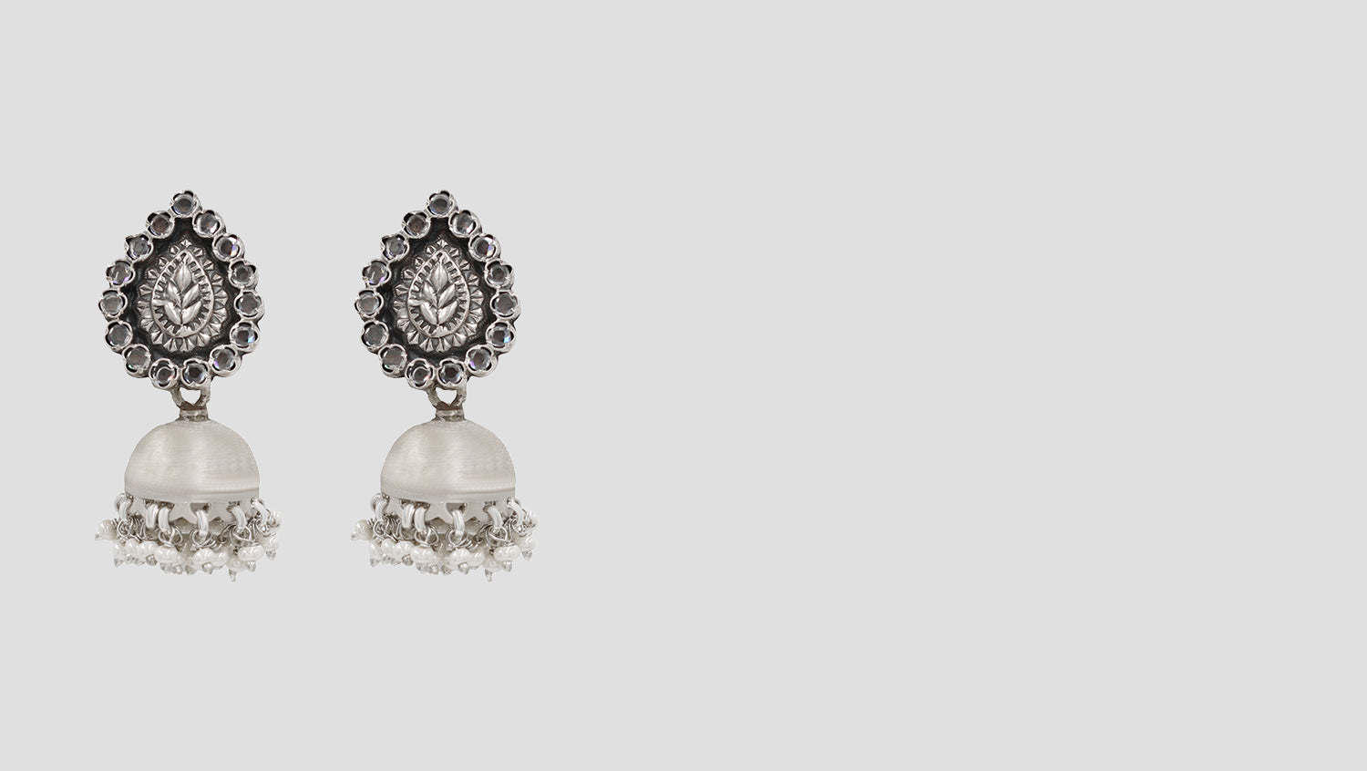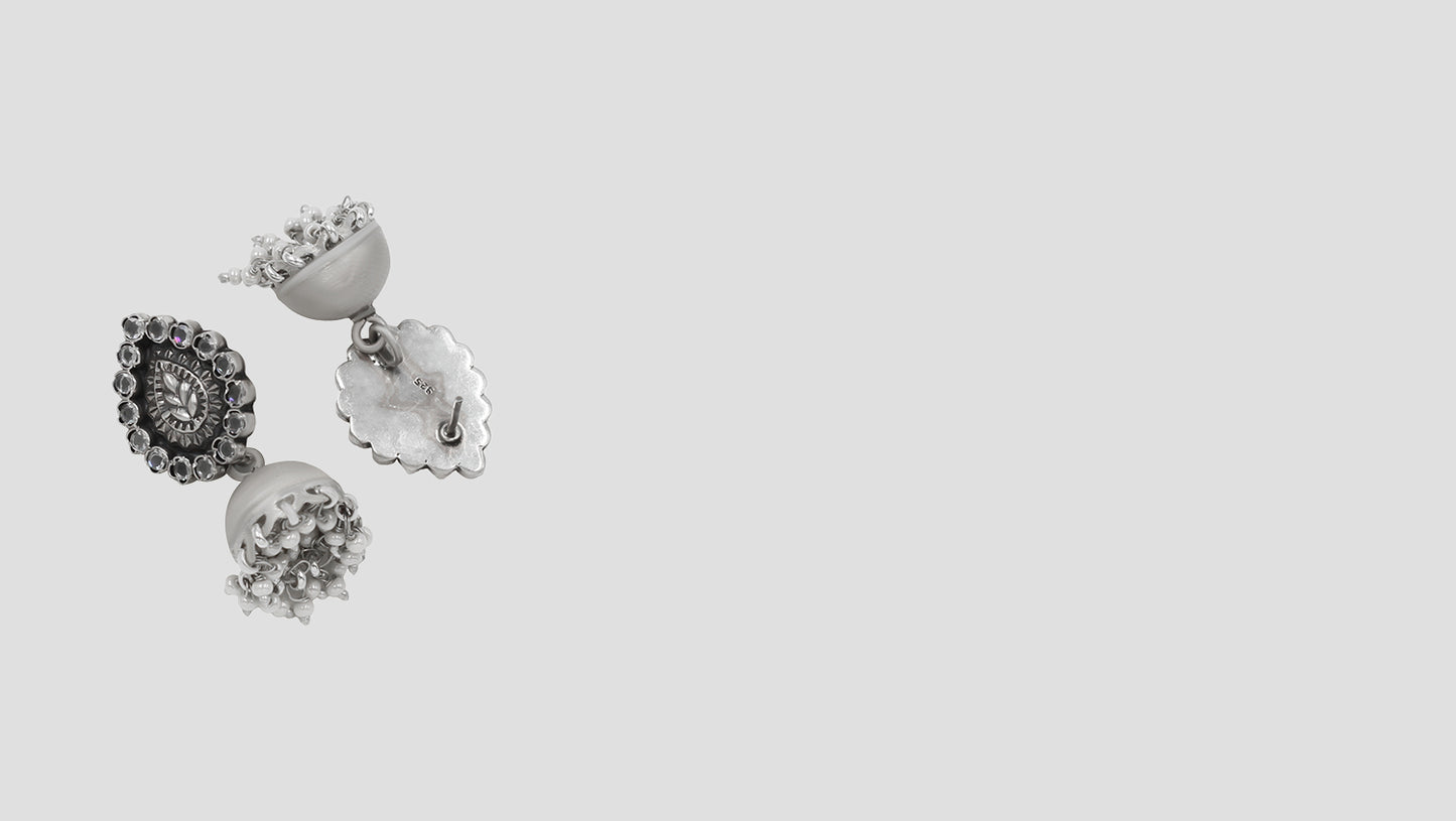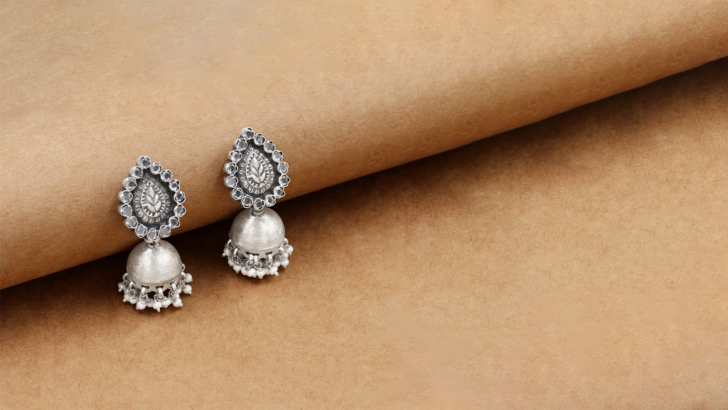 Embrace timeless tradition with these handcrafted silver jhumka earrings by Sangeeta Boochra.Featuring a beautifully embossed teardrop motif surrounded by intricate detailing, the dome-shaped jhumkas are finished with delicate silver beads that lend a festive charm. Perfect for ethnic ensembles or fusion fashion statements.