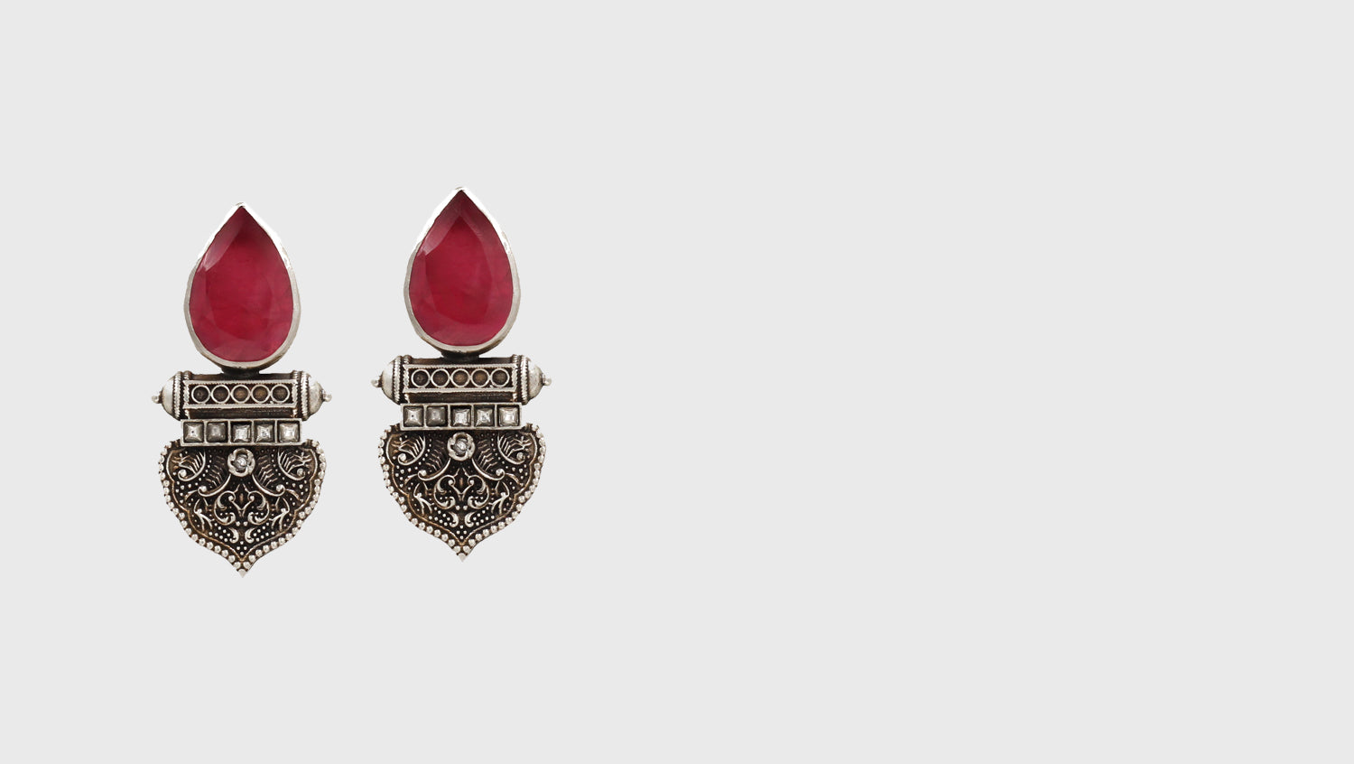 Indulge in the magnificence of Sangeeta Boochra's handcrafted 925 silver earrings, an ode to timeless craftsmanship and heritage. Featuring an intricately detailed silver base adorned with delicate filigree work, these earrings exude a regal charm. The bold teardrop-shaped pink gemstone adds a striking contrast, enhancing their vintage appeal. Designed for the modern woman who appreciates traditional artistry, these earrings are perfect for elevating both ethnic and fusion ensembles. Let every detail tell a story of elegance, sophistication, and handcrafted perfection.