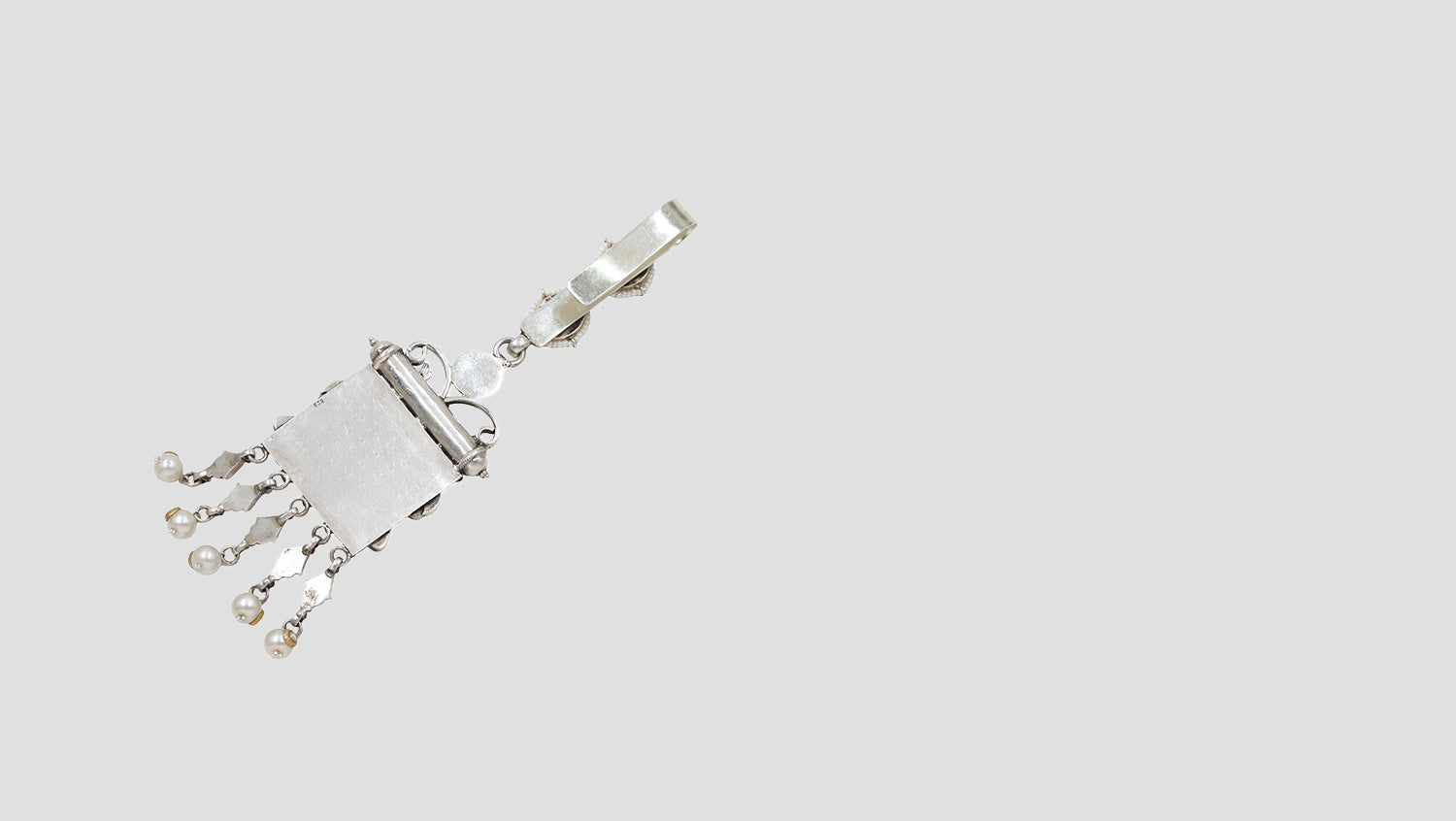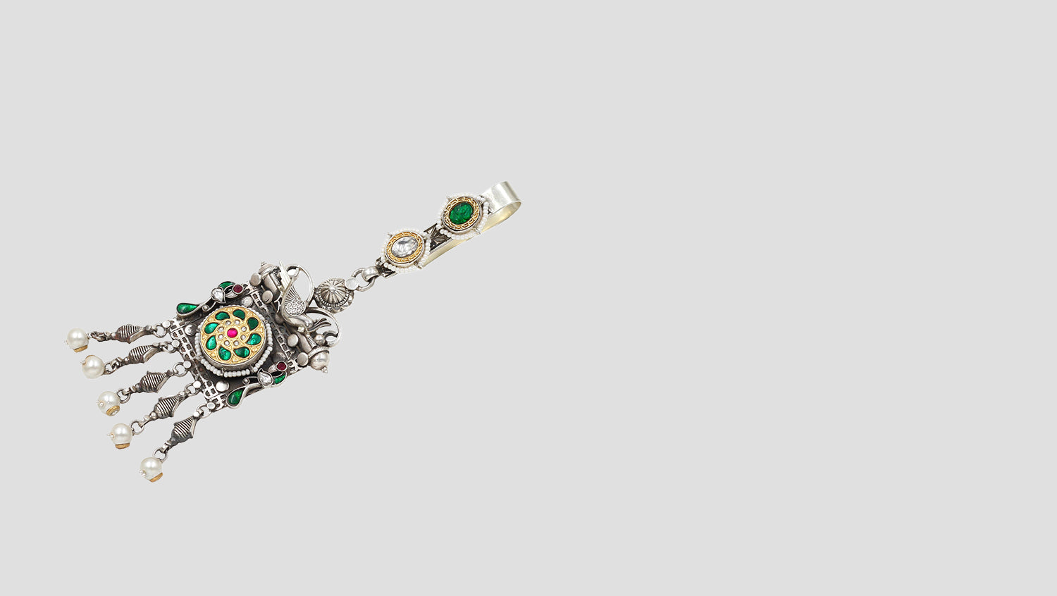 Experience the grandeur of heritage craftsmanship with this 925 silver keychain by Sangeeta Boochra. Adorned with intricate engravings, vibrant gemstone inlays, and delicate pearl droplets, this piece captures the essence of regal artistry.