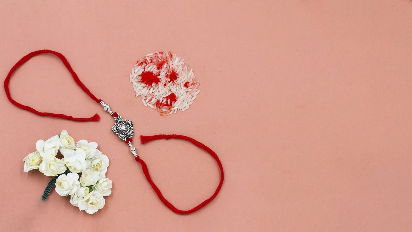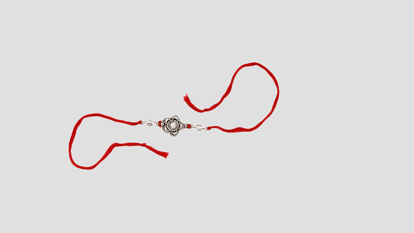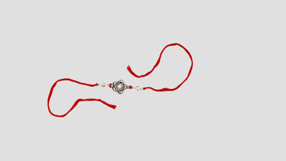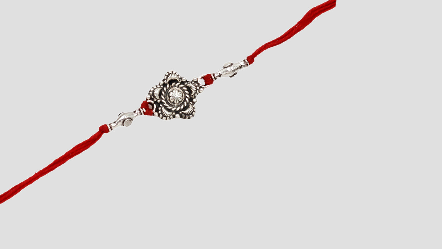 Elegant and rooted in tradition, this silver rakhi from Sangeeta Boochra is adorned with a vintage floral centerpiece. Designed to reflect grace and love, it’s a thoughtful expression of your sacred bond this Raksha Bandhan.