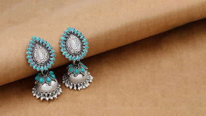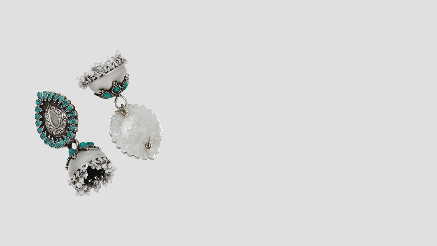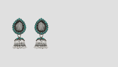 Grace meets tradition in these handcrafted silver jhumkas by Sangeeta Boochra. Featuring a classic teardrop motif surrounded by rich green enamel work, these earrings embody old-world charm and timeless style.