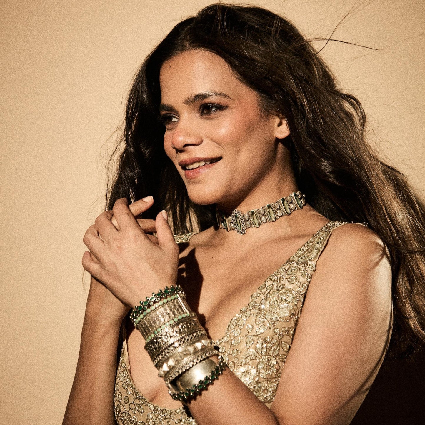 Discover a tapestry of heritage and elegance with this handcrafted silver choker and stacked bangles, adorned with delicate green accents. Worn beautifully by Srishti Shrivastava, each piece by Sangeeta Boochra celebrates India’s artisanal legacy.