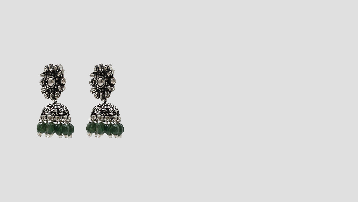 Inspired by traditional Indian craftsmanship, these oxidized silver jhumkas from Sangeeta Boochra exude royal charm with intricate floral motifs and emerald-green bead embellishments.