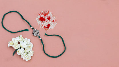 Celebrate the essence of Raksha Bandhan with this intricately handcrafted silver rakhi, featuring ornate heart motifs and a traditional floral center. A timeless creation from Sangeeta Boochra.