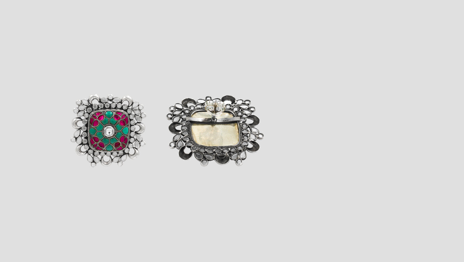 Sangeeta Boochra handcrafted silver earrings featuring pink and green stone work, antique silver detailing, and floral-inspired square design—perfect for festive wear, ethnic outfits, and elegant everyday styling.