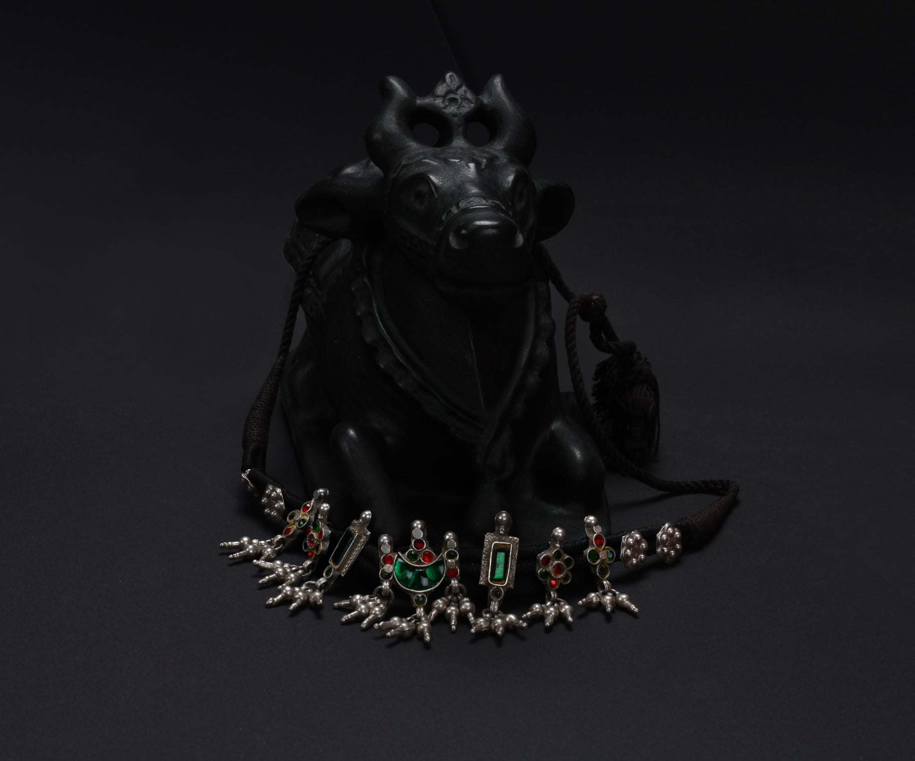 Handcrafted Silver Choker With Green Emerald And Red Stone