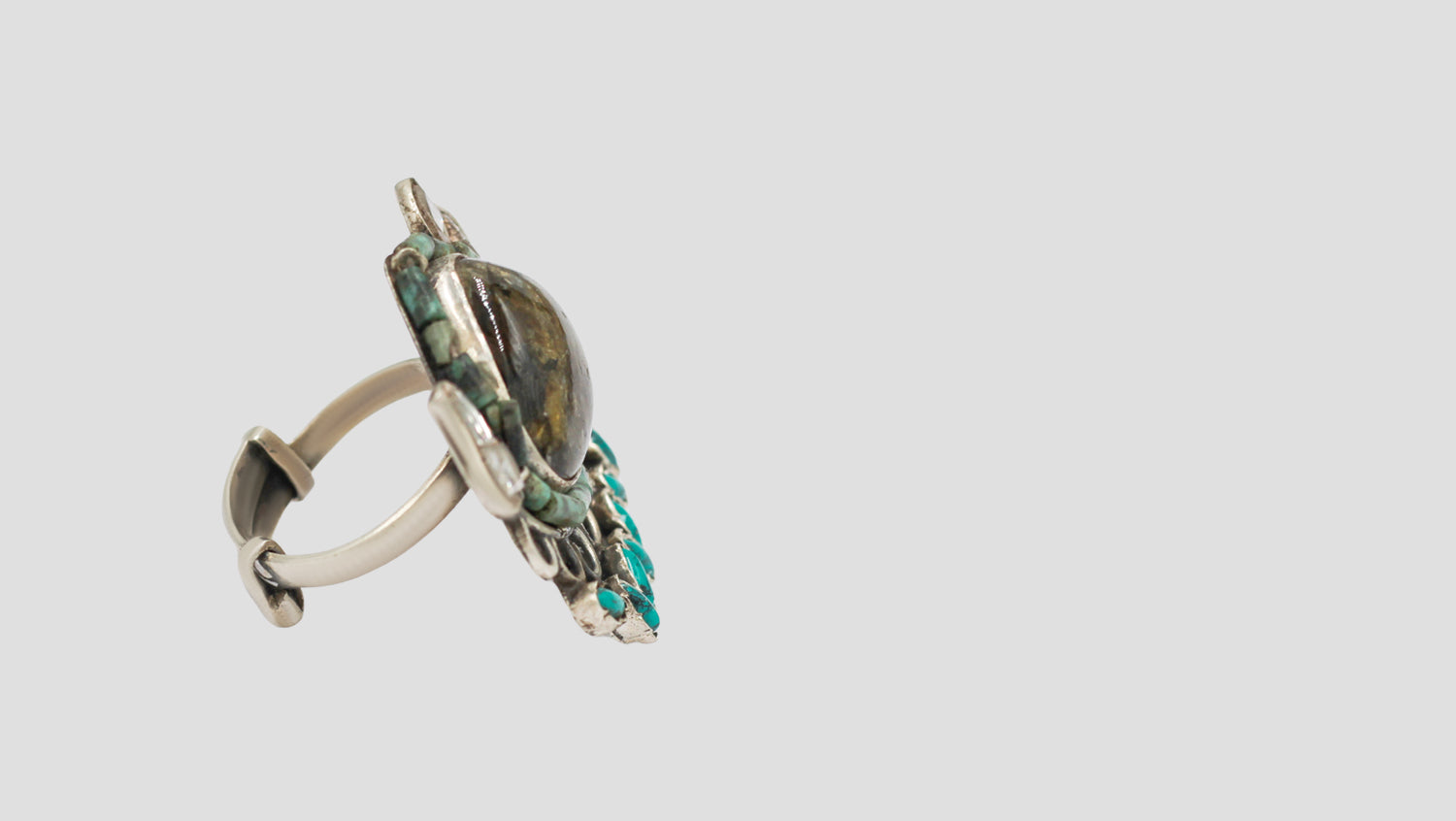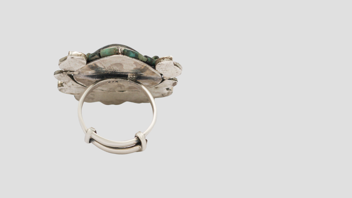 Add a touch of earthy elegance to your look with this Sangeeta Boochra handcrafted silver ring, featuring a shimmering gemstone framed by green accents and traditional motifs.