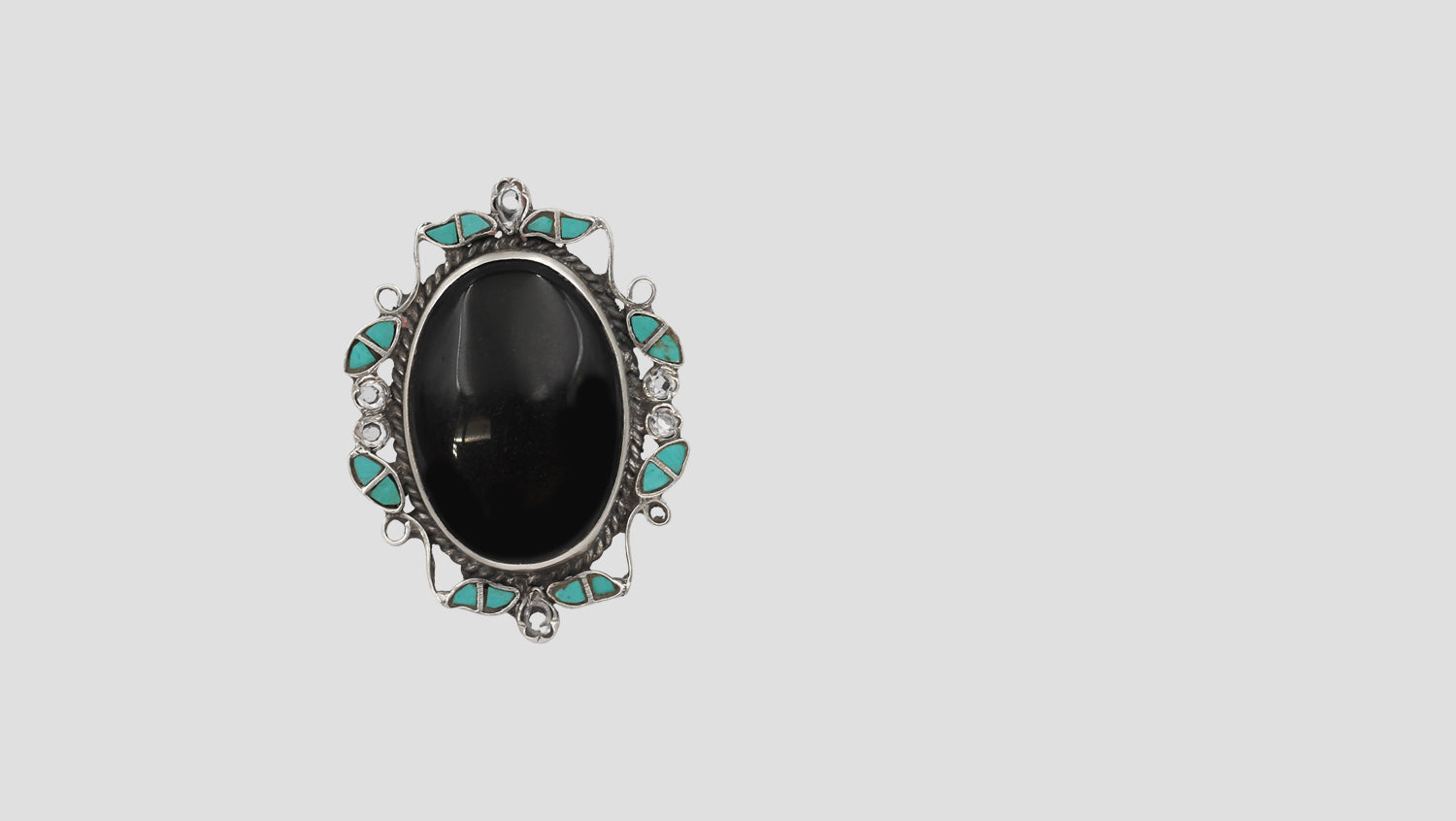 This handcrafted silver ring by Sangeeta Boochra features a smooth oval black stone framed by intricate silver work and inlaid detailing. The balanced contrast of textures and tones gives the ring a refined yet distinctive presence.