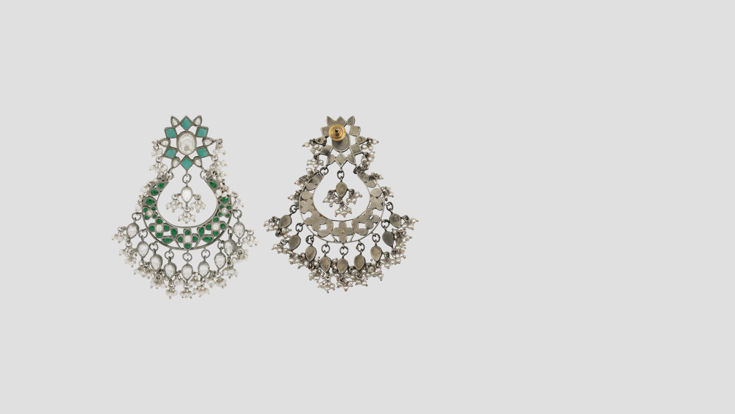 These exquisite earrings from Sangeeta Boochra showcase the charm of traditional kundan artistry. The radiant green kundan detailing paired with glistening white stones and pearl clusters creates a statement piece that reflects classic elegance.