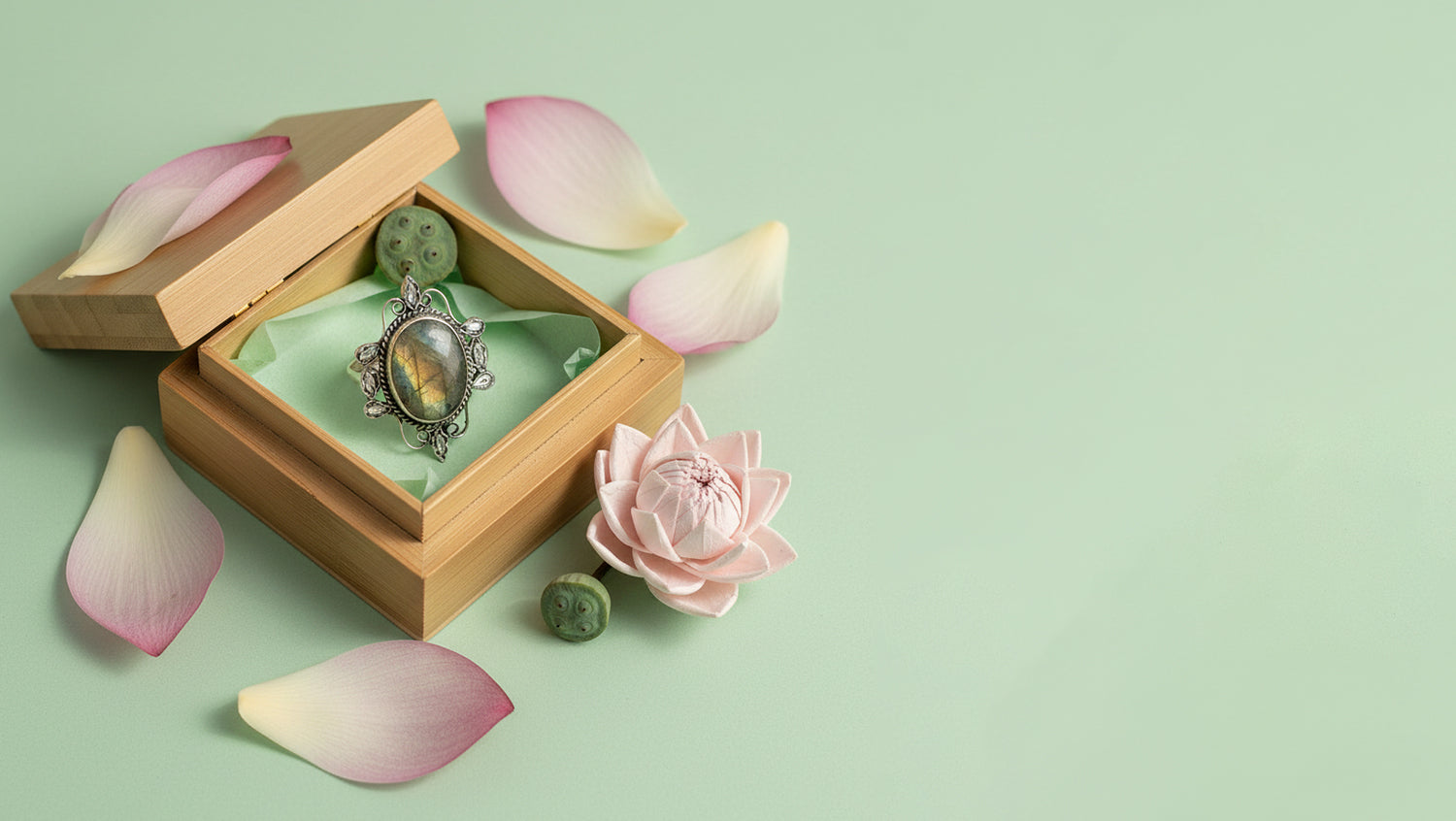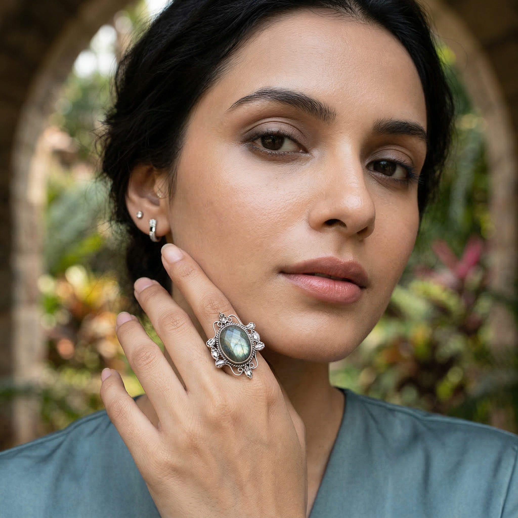 Handcrafted in sterling silver, this Sangeeta Boochra ring features a luminous labradorite stone with natural flashes of gold and green, framed by intricate artisanal detailing.