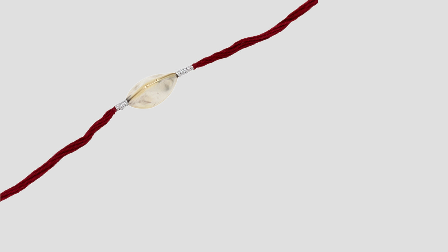 An expression of timeless love and tradition, this rakhi features a polished silver cowrie shell — a symbol of prosperity — crafted by the artisans of Sangeeta Boochra.