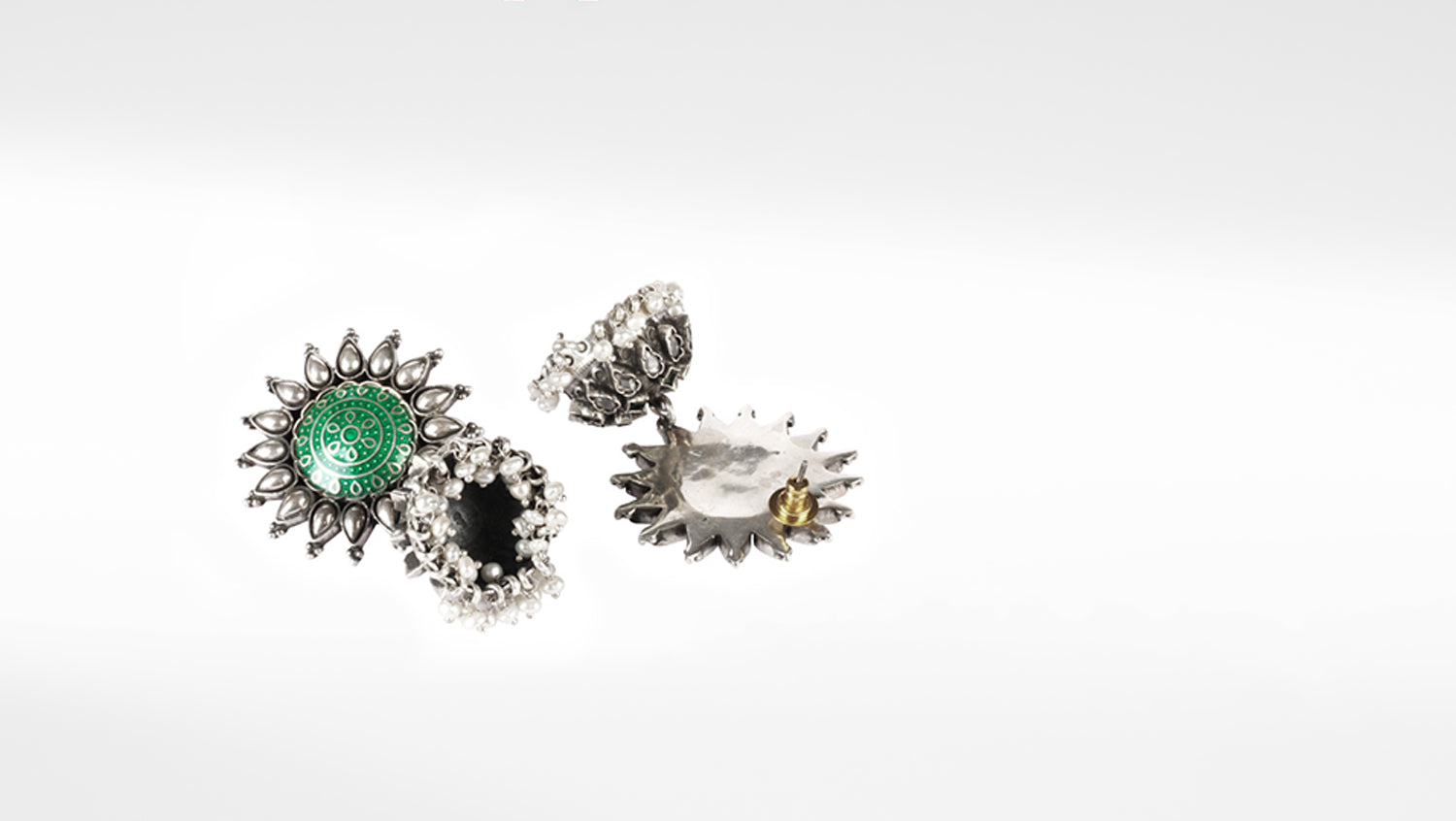| Features meenakari pair of Jhumki's with a traditional rajasthani touch. A big emerald is embellished with meenakari work and attached in falling jhumki with pearl drops. |