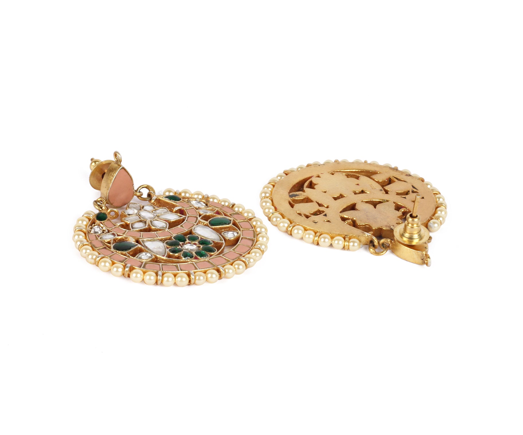 Exclusively designed for women who adore elegance, this pair of handcrafted earrings from Sangeeta Boochra will enhance your look in no time. This pair is manufactured using silver which is sure to catch your glance at the very first instance. The pair is highlighted with 24 kt gold plating along with CZ and pearl stone. The enigmatic detailing makes this pair an alluring choice.