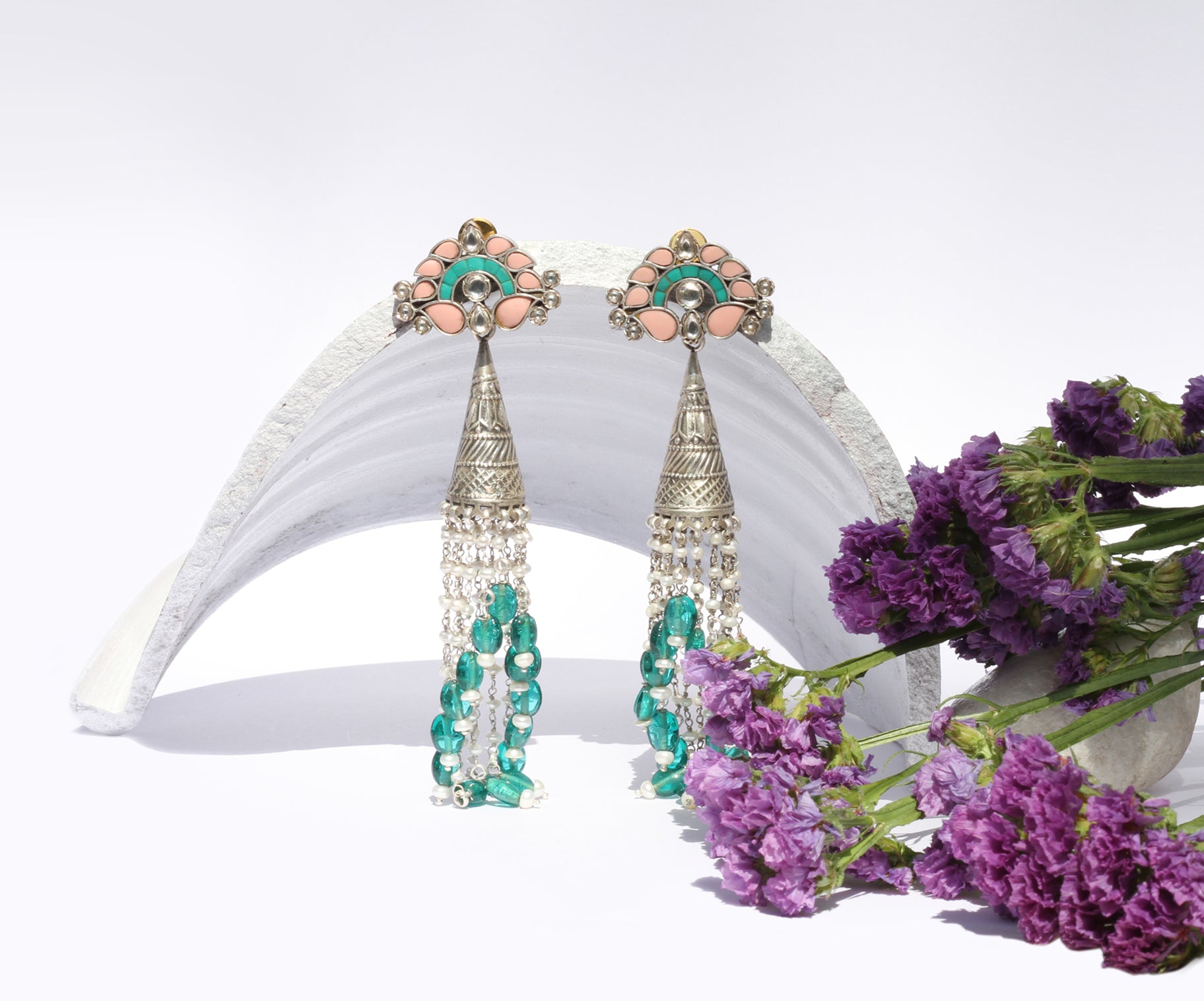 Handcrafted Silver Earrings With Peach Chalcedony And Turquoise Stone, By Hanging Pearl