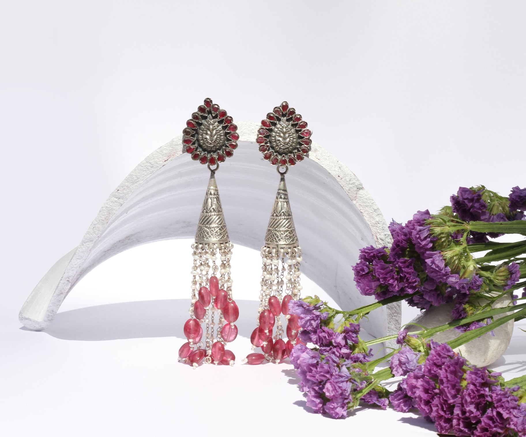 Handcrafted Silver Earrings With Ruby Stone, By Hanging Jhumki
