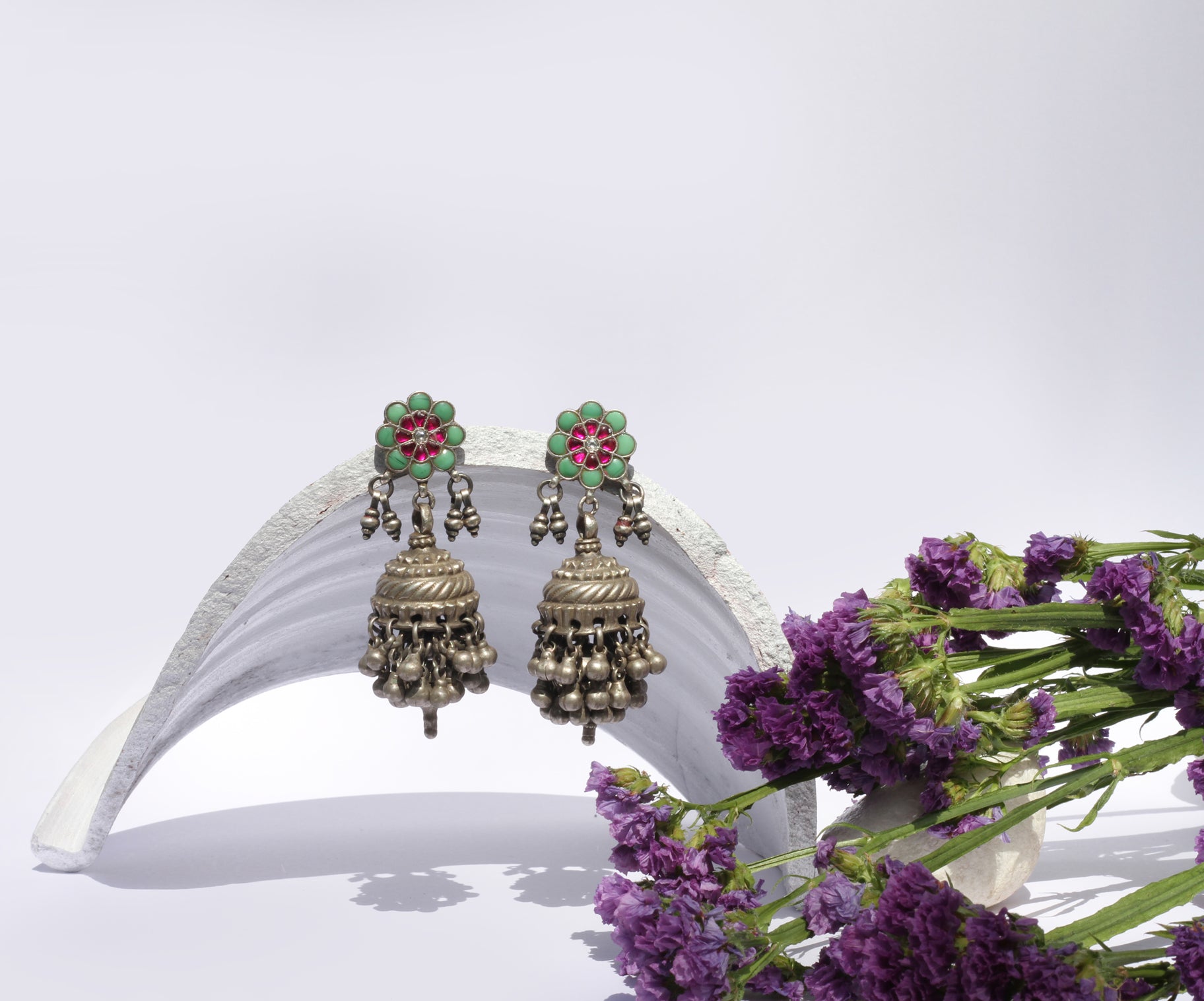 Handcrafted Silver Earrings With Kundan, Pink And Emerald Stone, By Hanging Jhumki