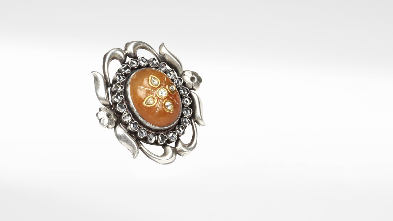 Silver Handcrafted Adjustable Traditional Motifs Onyx Ring with Gold Plated Inlay Work