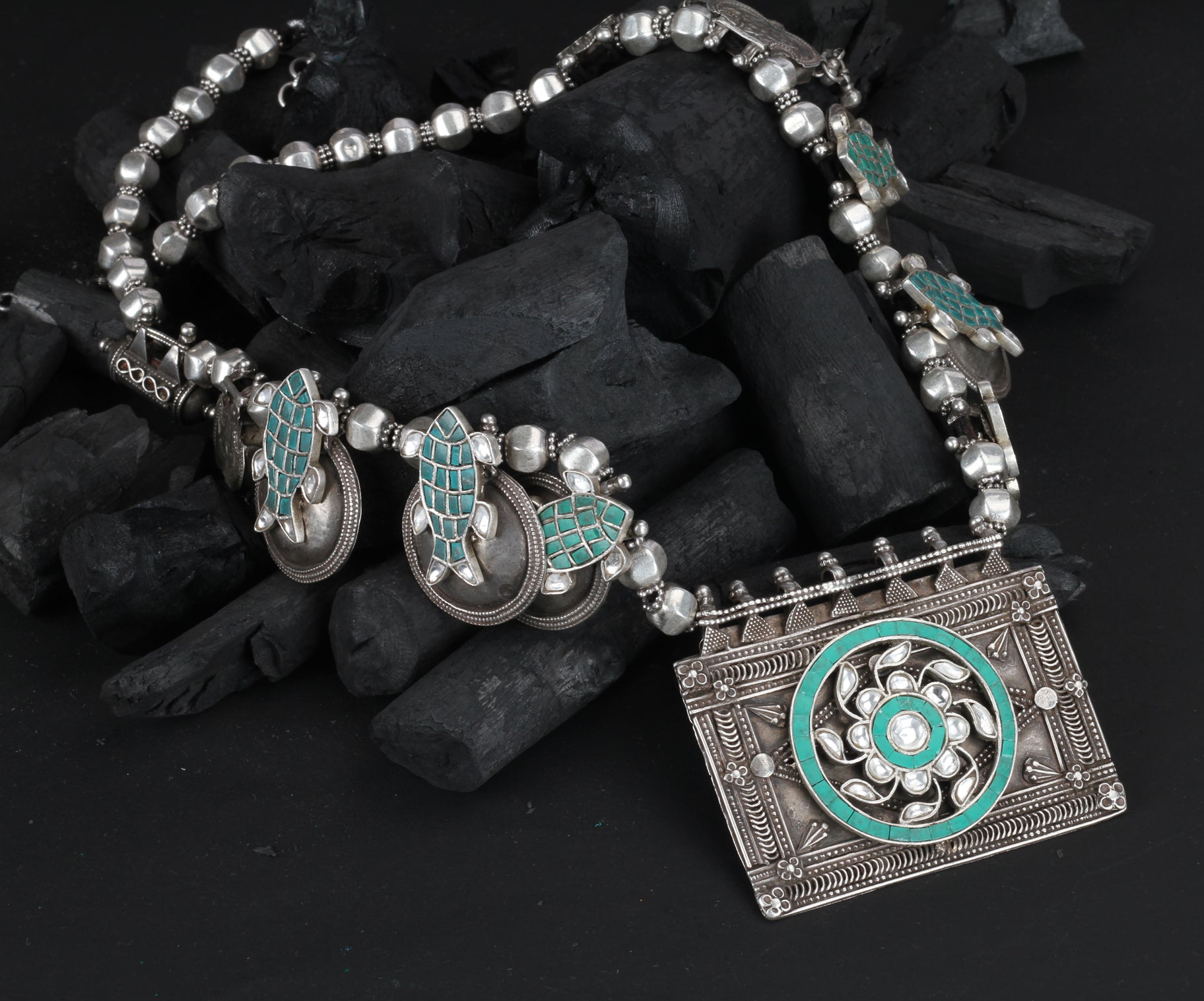 Let your jewelry collection come alive with this silver handmade necklace from Sangeeta Boochra. Using silver, the designer has created it with a simple yet stylish design to make it a fitting choice. The adornment of turquoise and kundan stones brings out its beauty even more.