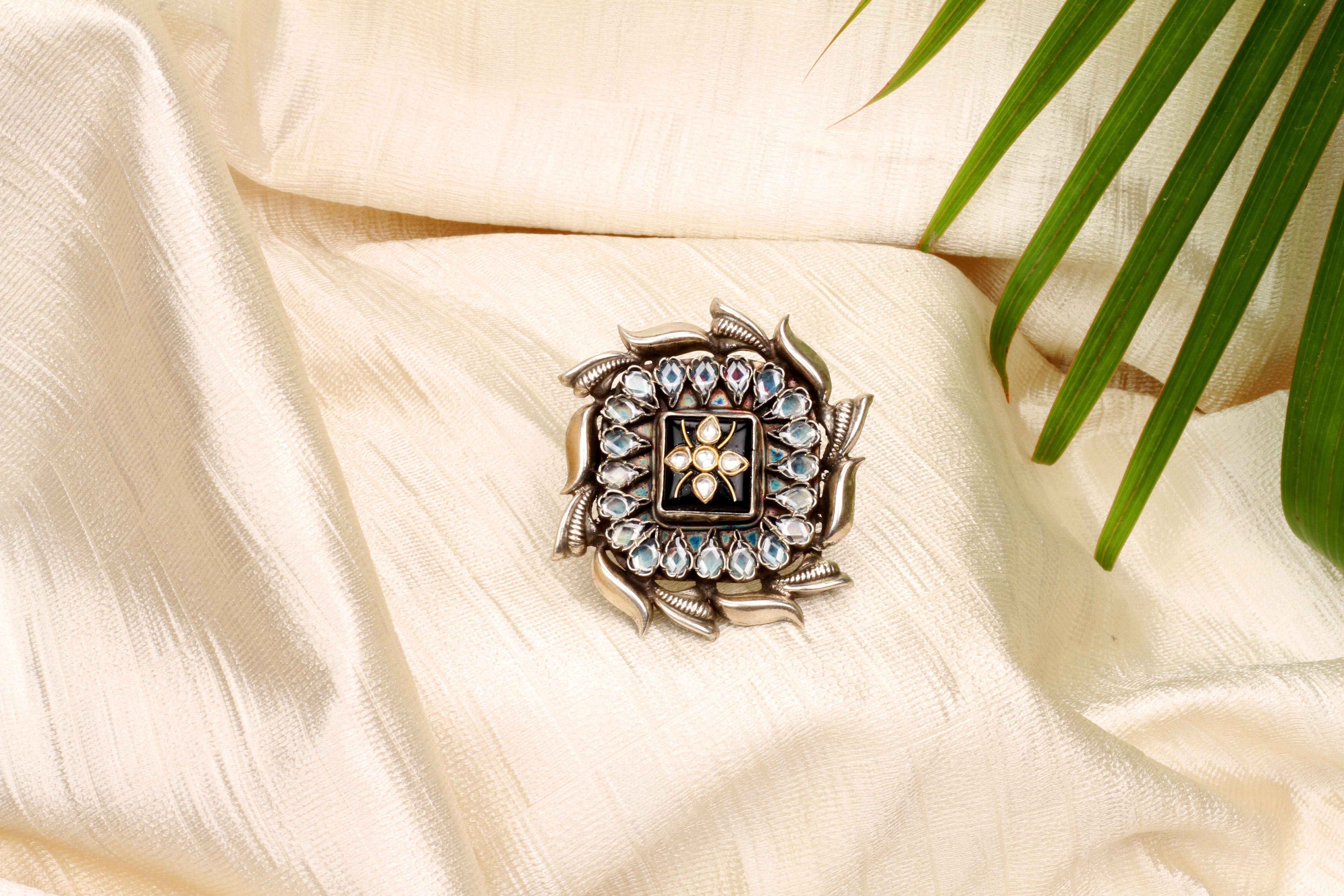 Silver Handcrafted Oxidised Traditional Adjustable Onyx Ring with Gold Plated Inlay Work