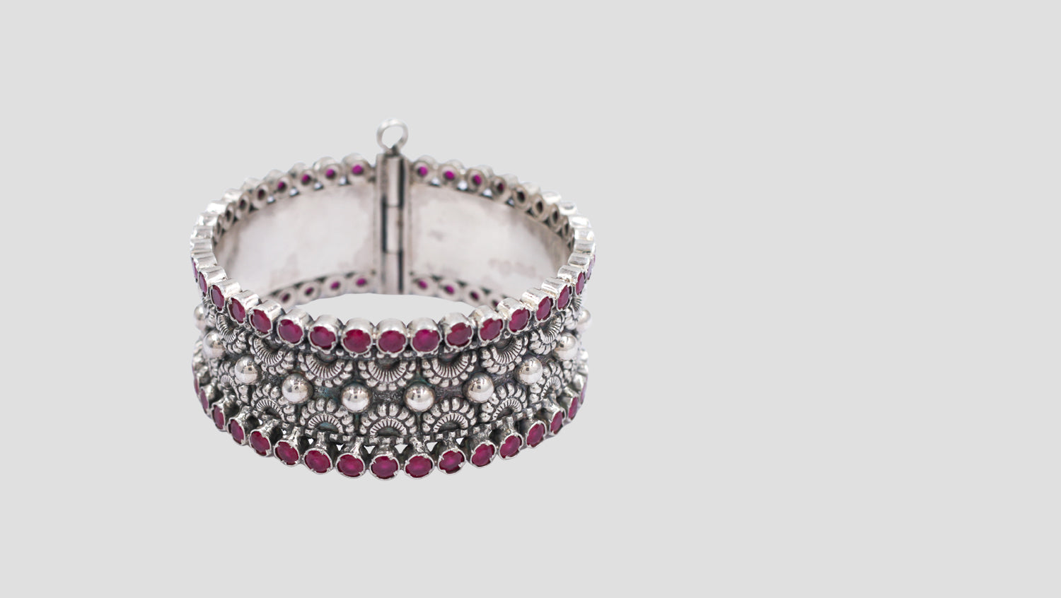 This striking silver bangle from Sangeeta Boochra showcases masterful artistry, featuring detailed motifs and a border of ruby-toned stones. Designed for women who value elegance and tradition, this statement piece is a true reflection of timeless Indian craftsmanship.