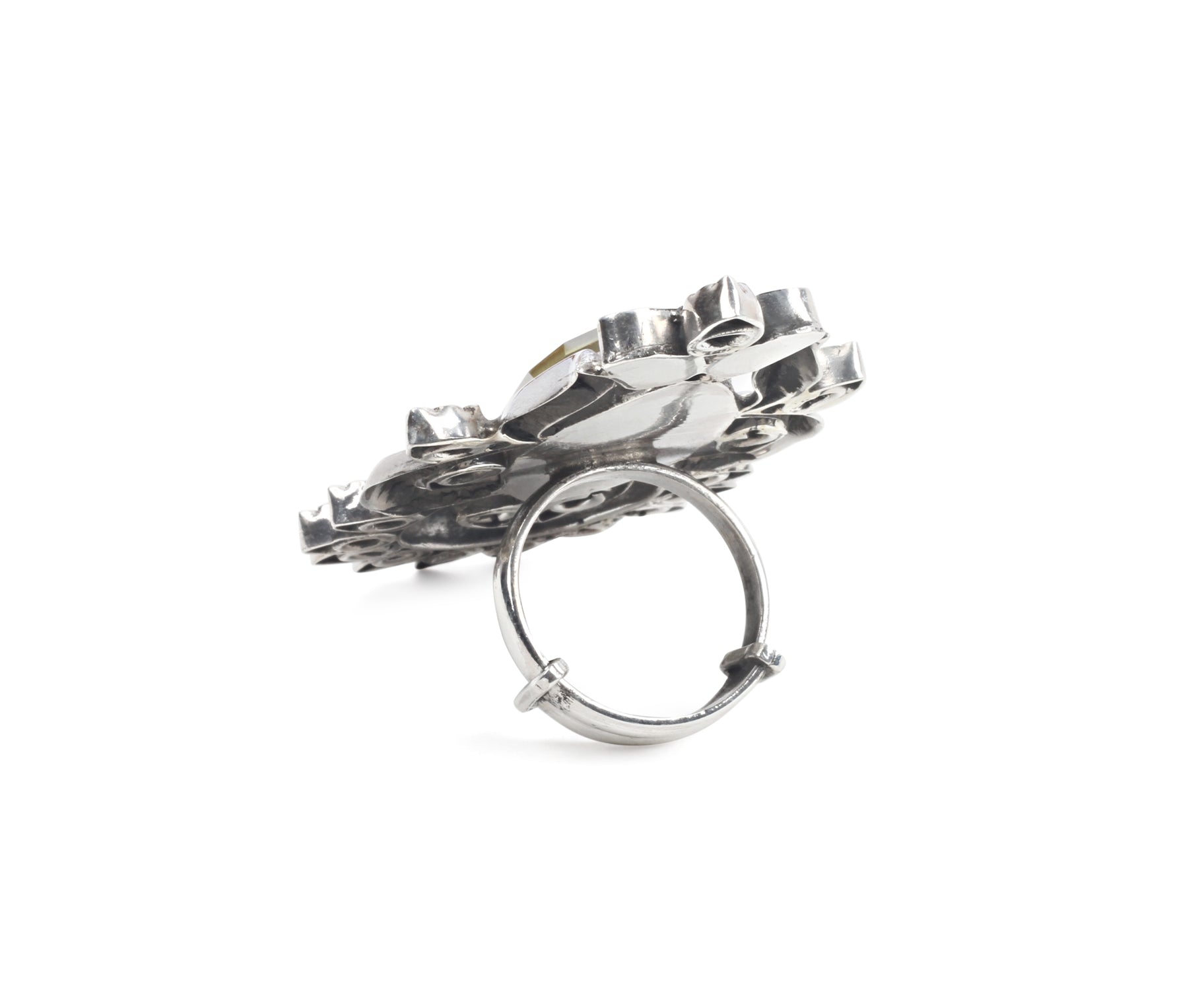 Revolutionize your fashion quotient by beautifying yourself with this ring from Sangeeta Boochra. This ring is crafted from 925 sterling silver. The kundan and stone structure on the ring is a perfect complement to the entire creation.