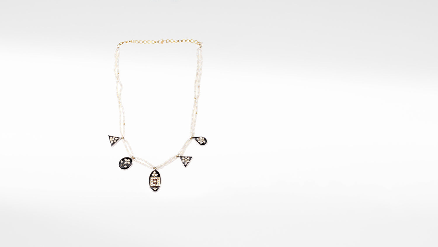 Silver Handcrafted Necklace with Black Onyx Stone with Gold Plated Inlay Work and Pearl Chain
