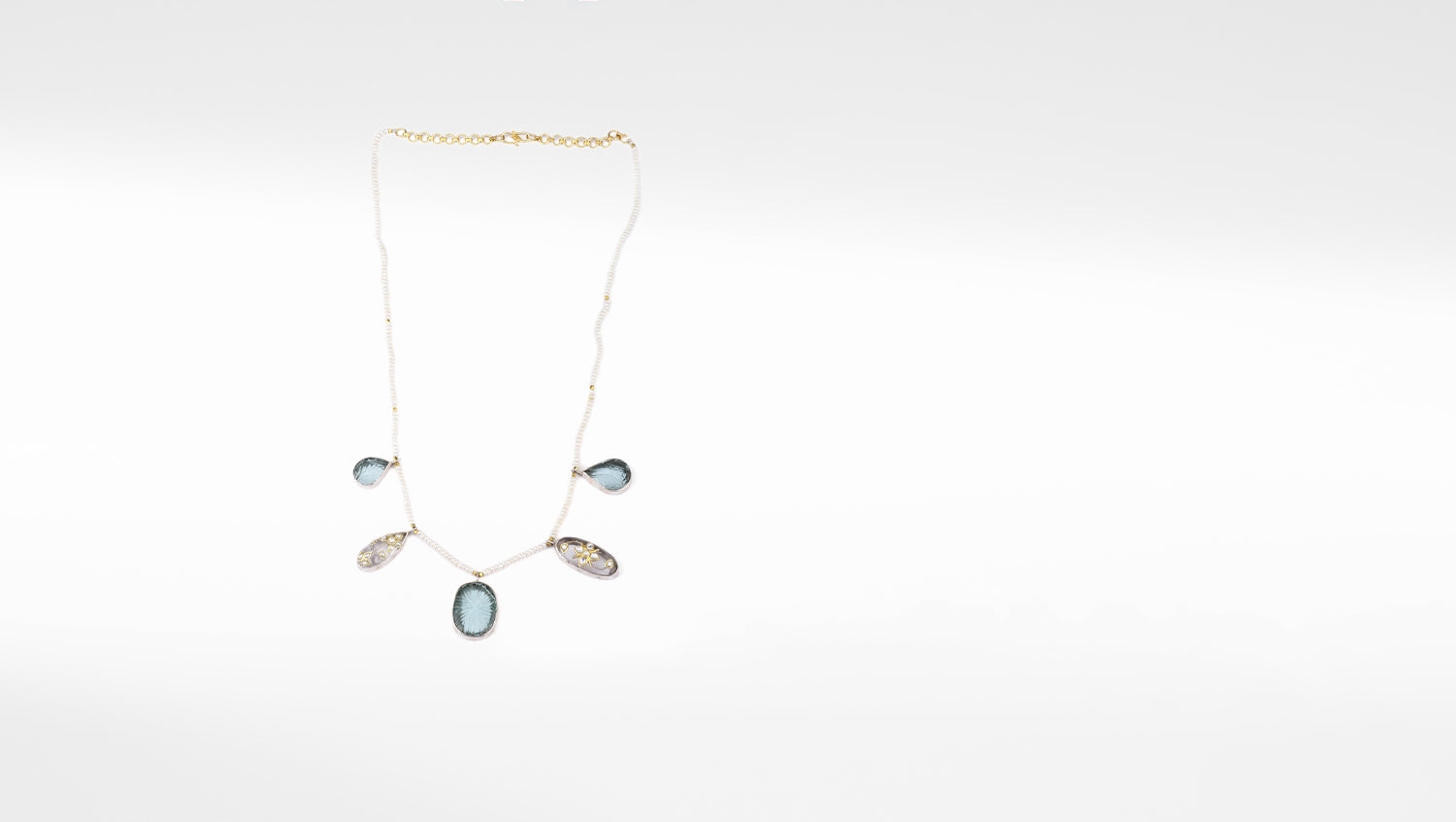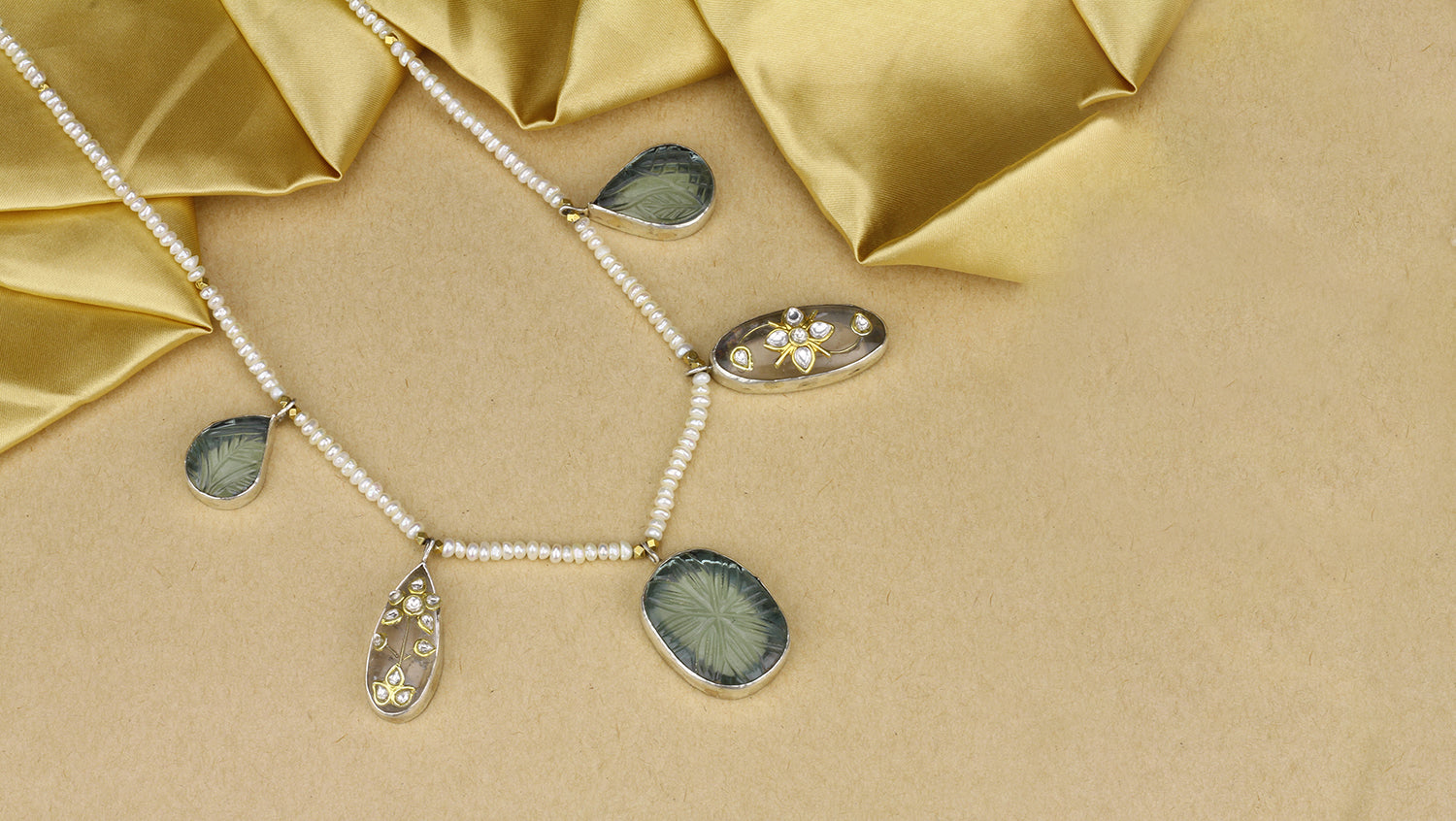 Silver Handcrafted Quartz and Crystal Stone Necklace with Gold Plated Inlay Work Along with Pearl Chain