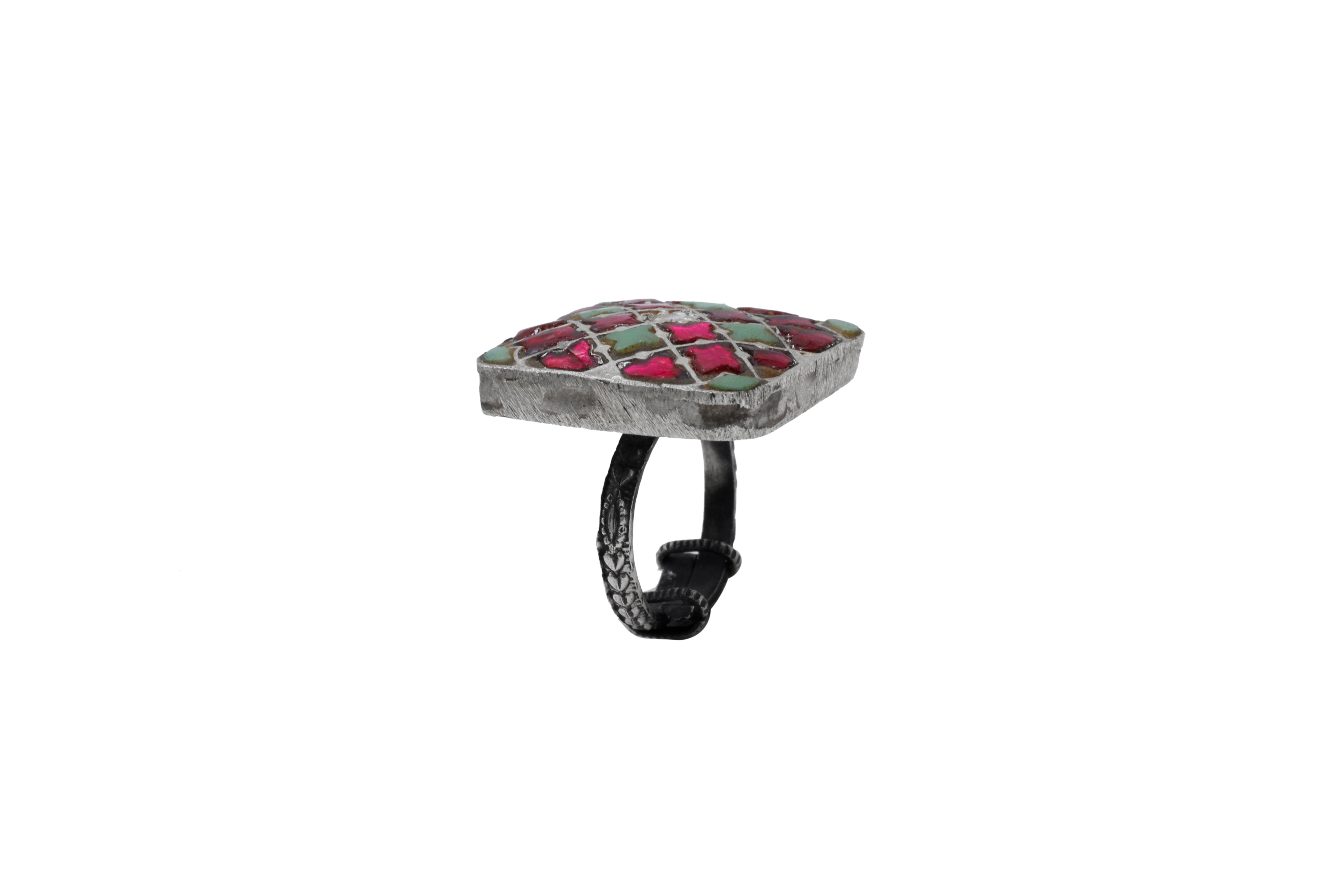 An impressive silver handcrafted adjustable ring with multicolored kundans.