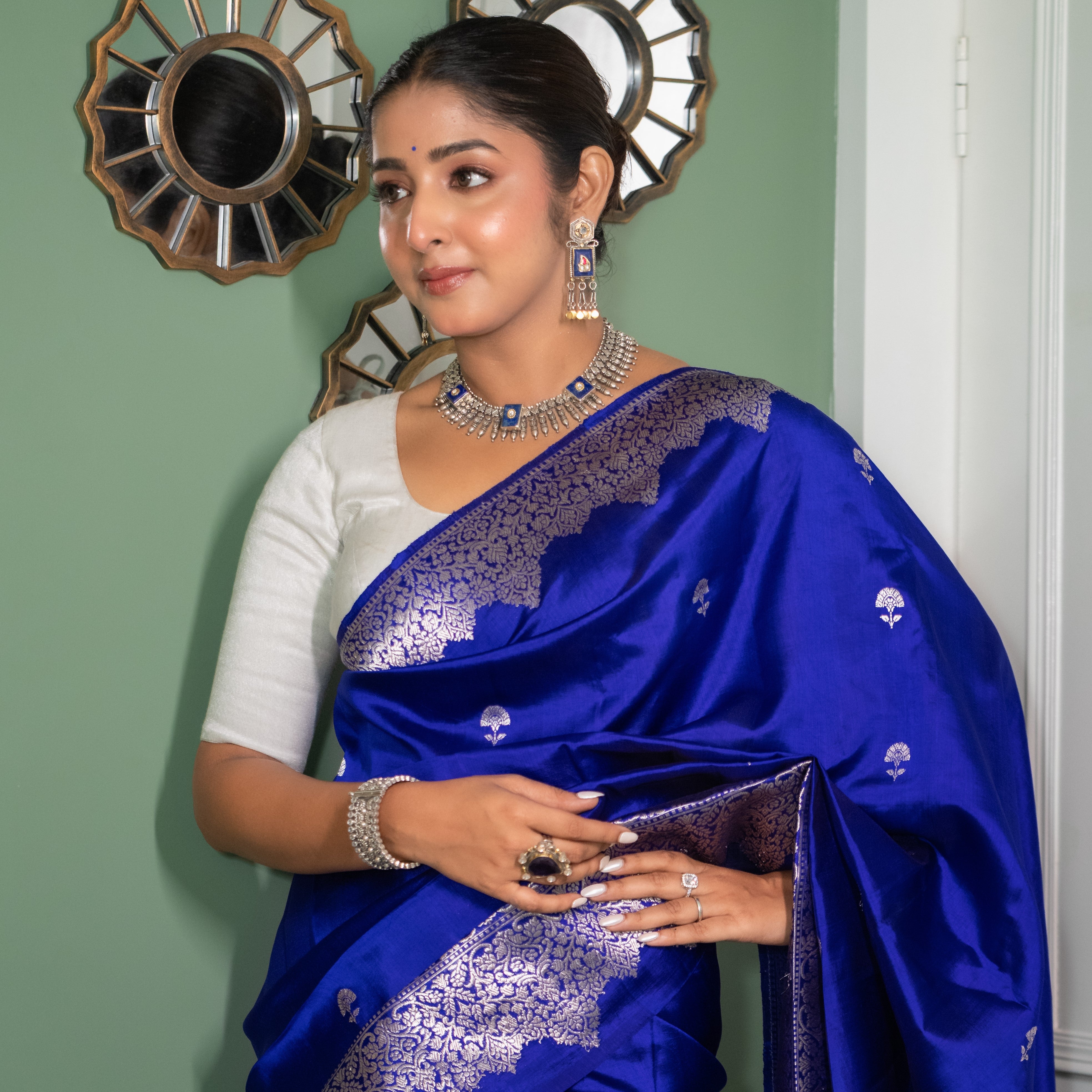 An elegant expression of contemporary heritage, this silver jewellery set by Sangeeta Boochra balances bold detailing with refined design. Styled by Swastika Ghosh, the ensemble captures poise, grace, and effortless sophistication.