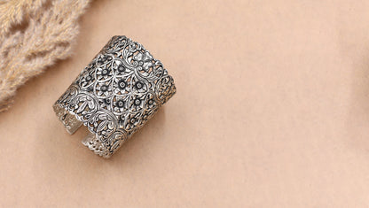 Handmade in sterling silver, this ornate cuff showcases exquisite traditional craftsmanship. A collectible from Sangeeta Boochra’s timeless collection, perfect for statement styling.