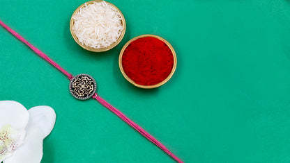 Make your Raksha Bandhan memorable with this artisanal silver rakhi, adorned with an ornate gold-tone floral swirl and vibrant thread. A perfect fusion of cultural richness and designer finesse.