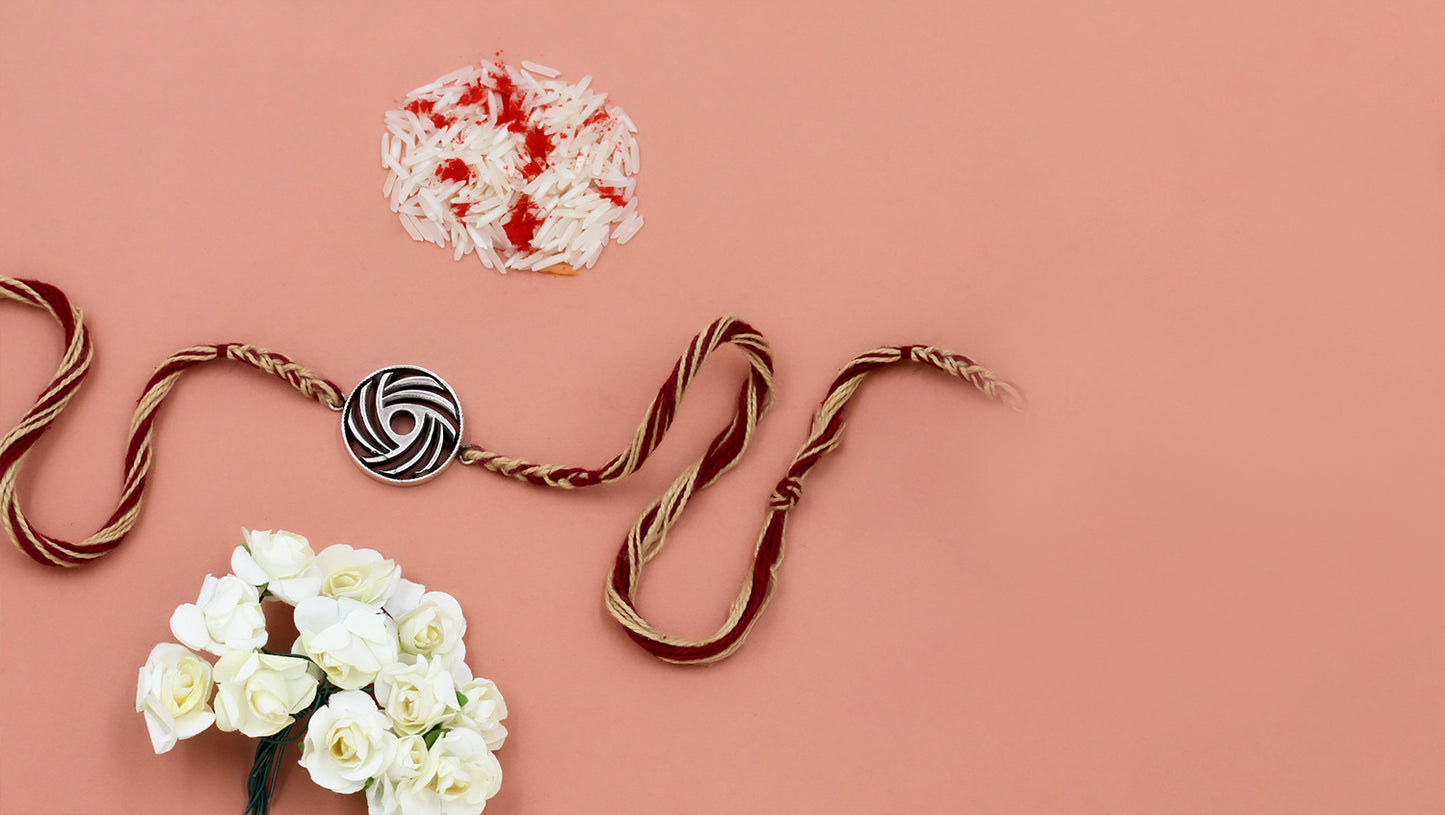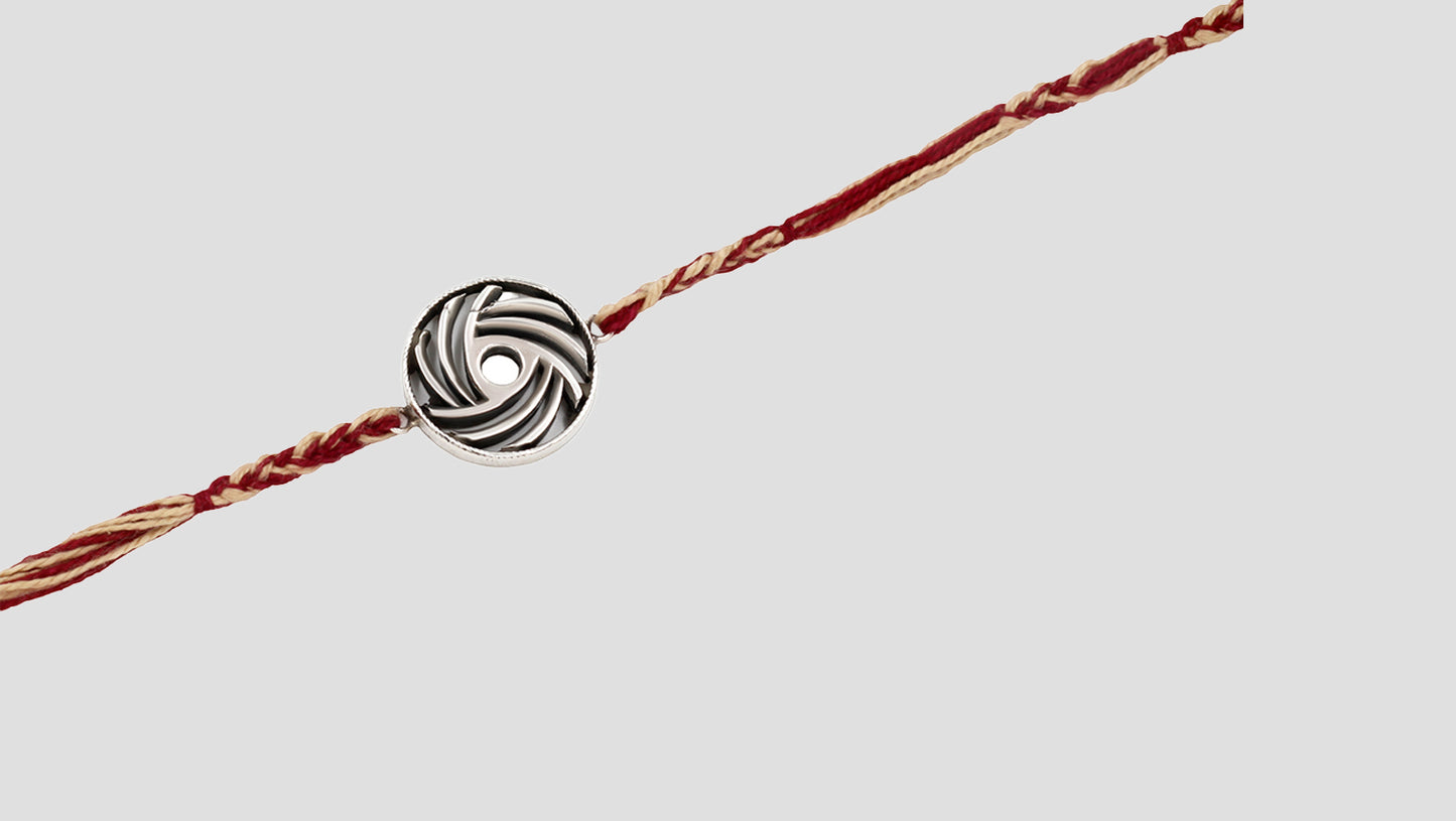 Inspired by the flow of time and energy, this handcrafted silver Rakhi features a swirling motif that represents continuity, unity, and protection—perfect for celebrating the eternal sibling bond.