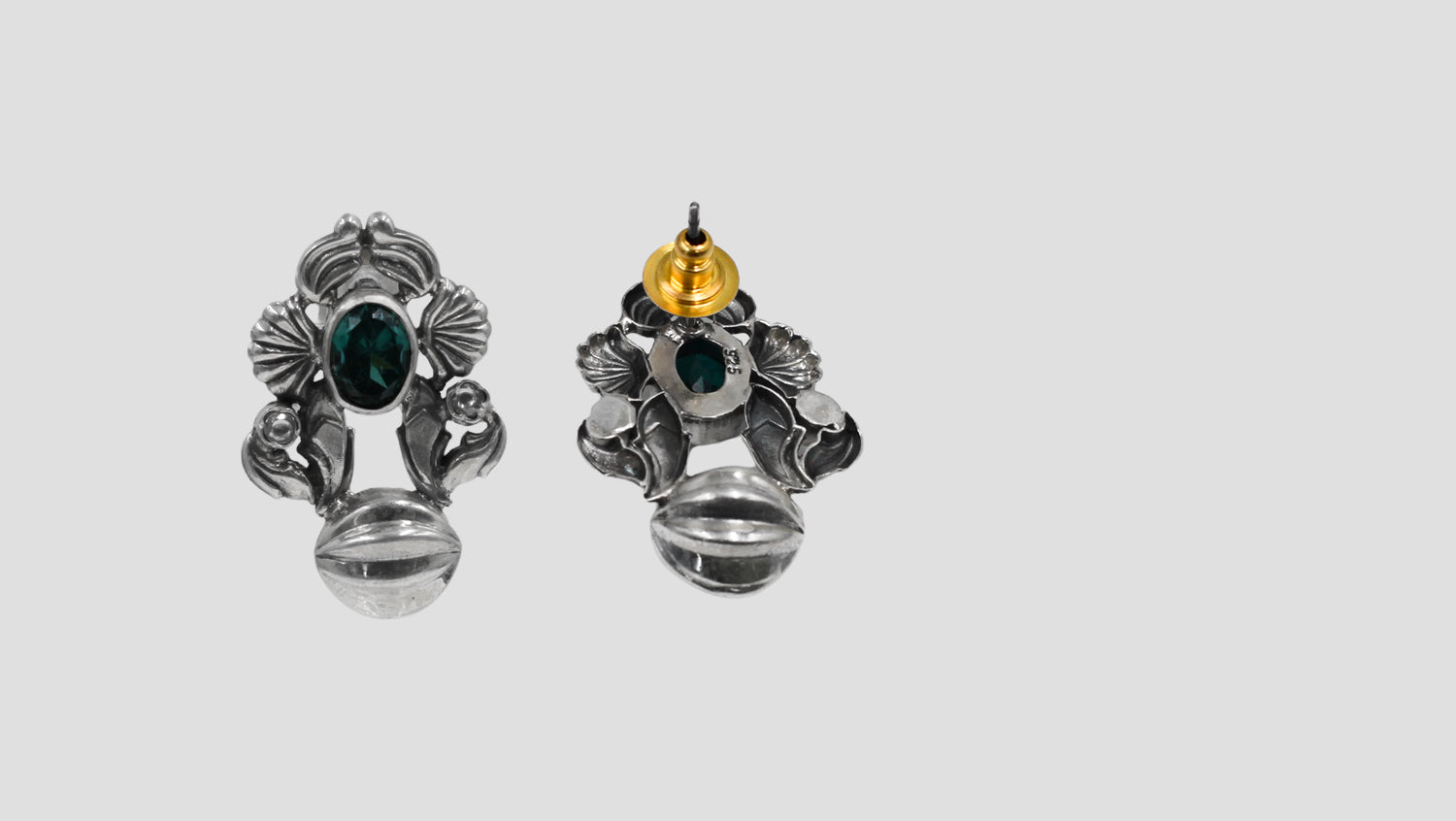 From the heritage collection of Sangeeta Boochra, these silver earrings feature exquisite detailing, a striking green gemstone, and a design inspired by traditional Indian artistry.